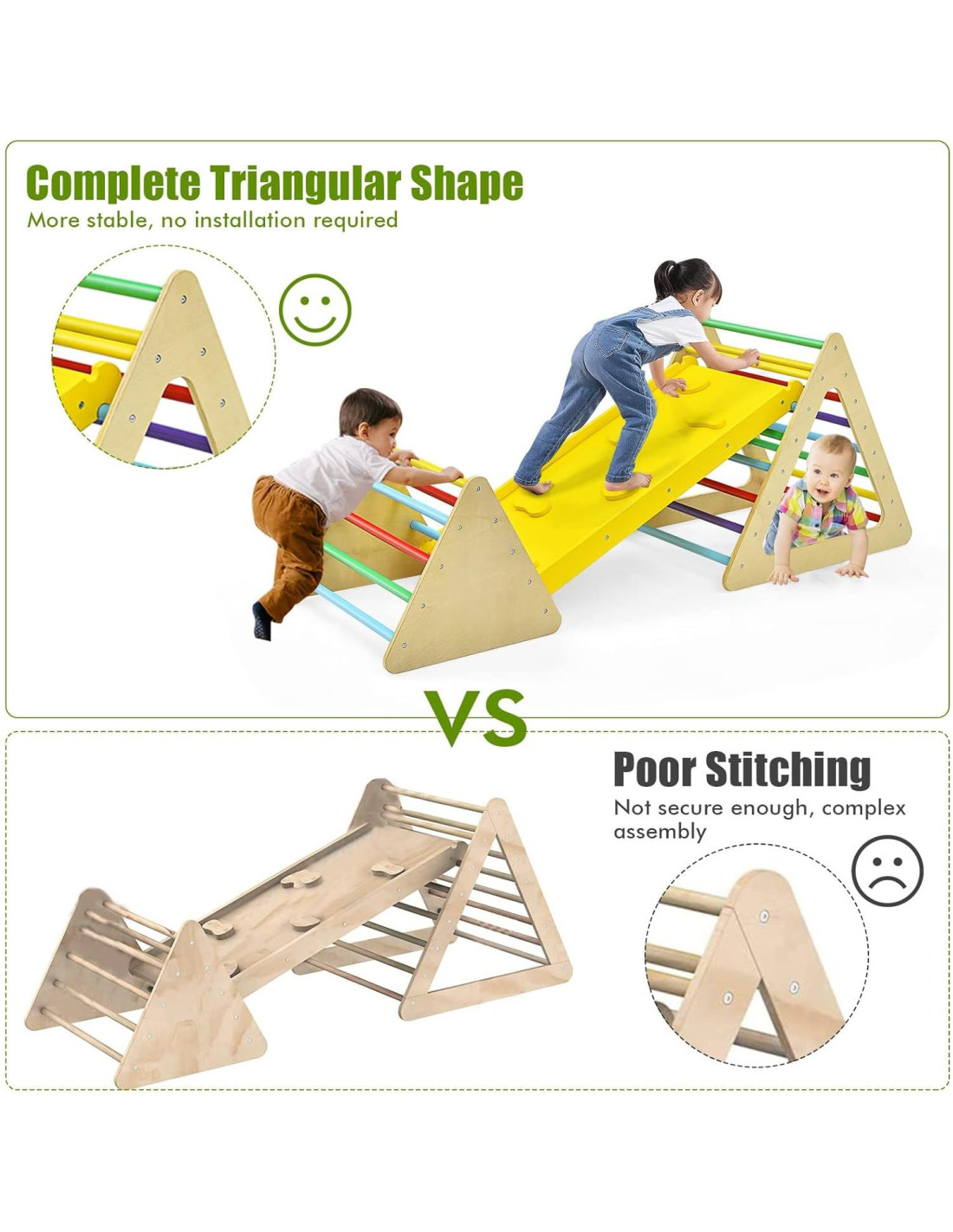 - [Juega Más Seguro con Materiales 100% Naturales!] Nuestro set de juego de escalada triangular utiliza 100% madera natural premium como materiales, ya que las tablas de la rampa están hechas de madera de abedul mientras que las varillas redondas están hechas de madera de haya, ambas caracterizadas por su gran durabilidad. También son no tóxicas e inodoras, más ecológicas, seguras y duraderas que los materiales plásticos, creando así un ambiente seguro para tus hijos al jugar.