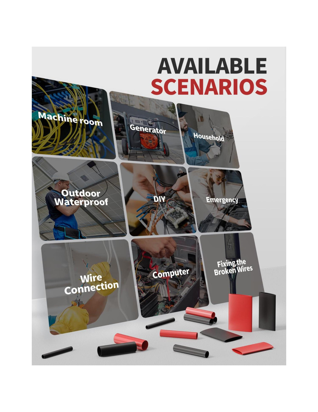 - TUBO DE DOBLE PARED: La pared exterior del kit de tubos termocontraíbles proporciona una resistencia a la abrasión extremadamente alta. La pared interior crea un sello impermeable de manera consistente y un excelente alivio de tensión. Nuestro tubo de envoltura de cable de alta resistencia es perfecto para cada aislamiento de cable.