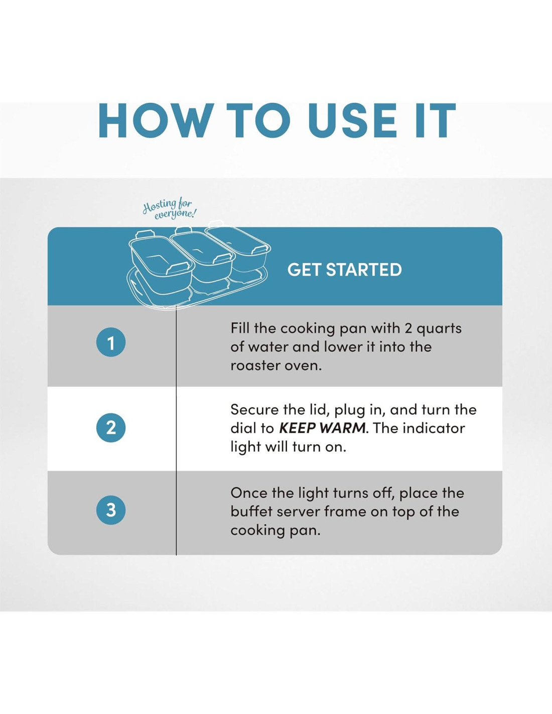Convierte tu Horno Asador AROMA en un servidor de buffet triple para fiestas, comidas compartidas y brunchs. Este versátil juego de accesorios incluye un marco superior de buffet y 3 bandejas de servicio que encajan perfectamente. Además, está recubierto con el mismo esmalte apto para alimentos que tu horno asador, ¡así que se ve y se siente como un juego perfecto! El calor por vapor es la mejor manera de mantener la comida de tu fiesta caliente y evitar que los platos se sequen. Simplemente llena la bandeja de cocción del horno asador con 2 cuartos (1.89 litros) de agua, coloca la tapa encima y gira el dial a Mantener Caliente. El horno asador eléctrico de AROMA se precalienta rápidamente y mantiene una temperatura estable y consistente. ¿Listo para comer? Coloca el marco superior de buffet en posición, luego coloca tus bandejas de servicio de buffet dentro. Las asas de la bandeja de metal son fáciles de agarrar, pero lo suficientemente pequeñas como para no estorbar. De horno asador a anfitrión de fiesta, ¡estos platos de buffet de 2 cuartos (1.89 litros) son el tamaño perfecto para guarniciones, salsas, sopas, albóndigas y más!