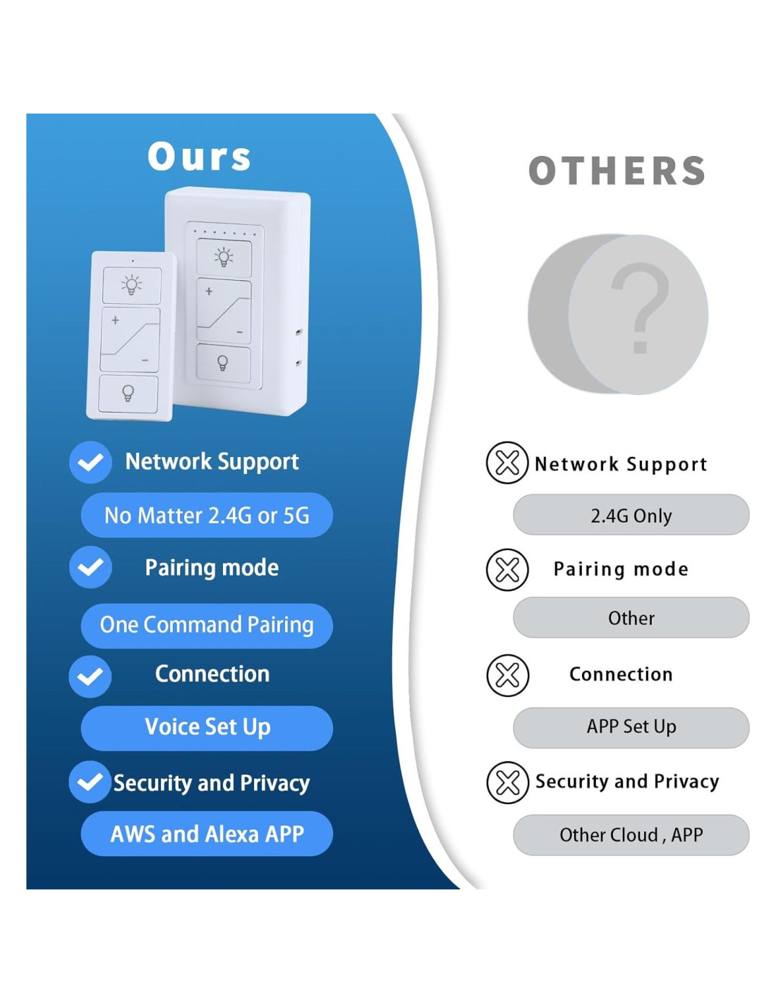 - Interruptor de atenuador digital, atenuación del 1%-100% y control por voz. Este interruptor de atenuador inteligente ajusta los niveles de brillo del 1%-100% con los asistentes de voz Alexa y Google Assistant, y facilita el control de las luces atenuadas enviando comandos de voz como 'Alexa, atenúa las luces de la sala a 60%'. El interruptor de luz Wifi tiene una función de memoria de brillo que recuerda la última configuración de luz cuando se apaga.