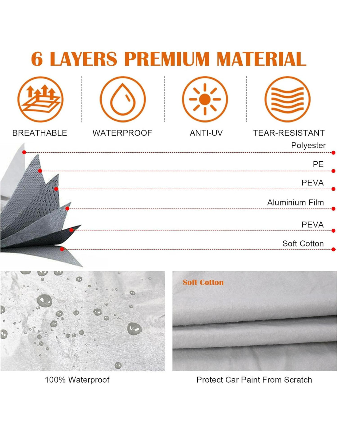 - Materiales Premium: 1: Hecho de PE Externo y Poliéster Plateado, que es 100% impermeable, 2: El aluminio altamente reflectante es bueno para proteger del sol, mantiene el coche fresco en días soleados. 3. Forro de algodón interior para proteger la pintura de tu coche