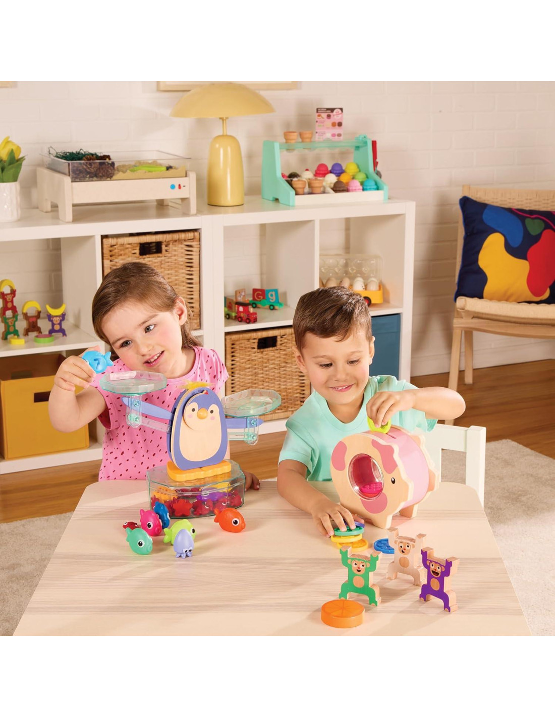 Pesado, ligero, grande, pequeño - aprende estos conceptos con la Balanza Matemática Pingüino de Battat Educación y diviértete. Este juguete de balanza matemática viene con 30 amigos criaturas marinas para pesar: 19 peces pequeños, 9 peces grandes, y un calamar y una estrella de mar con pesos misteriosos. Colócalos en las bandejas del amigable pingüino y mantenlo equilibrado. Este juguete de equilibrio es una gran herramienta para practicar habilidades matemáticas básicas, como la suma y la resta, y para introducir los conceptos de peso y tamaño a tu pequeño. Sin mencionar que tu pequeño estará ejercitando sus habilidades de resolución de problemas mientras encuentra formas creativas de mantener la balanza equilibrada. Hay 3 libros de juego en diferentes niveles de desarrollo incluidos para un tiempo de juego guiado - cada uno tiene objetivos de aprendizaje específicos con actividades educativas relacionadas. Además, este juguete matemático también viene con almacenamiento incorporado: guarda los pesos debajo del pingüino y los libros de juego detrás de él. Todas las guías de juego, libros de juego y otros materiales escritos están en inglés. Hecho de materiales duraderos y sin preocupaciones, todos los productos de Battat Educación cumplen o superan los estándares de seguridad de la UE, EE. UU. y Canadá.