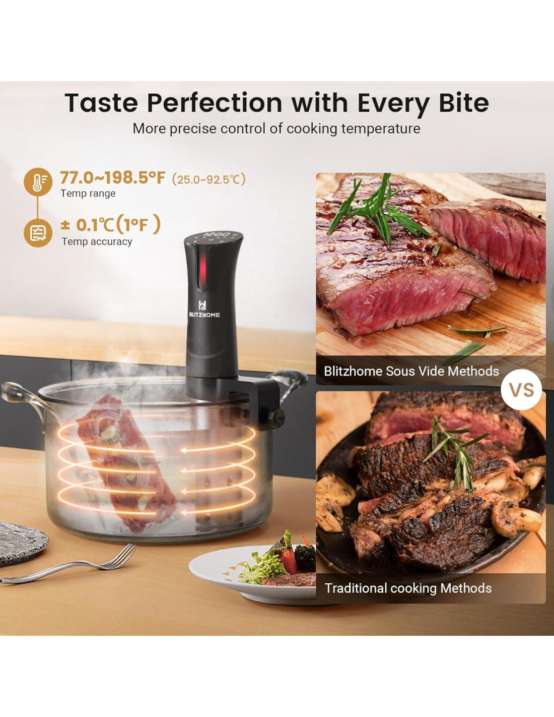 - Potencia de Cocción Eficiente Cocinero sous vide BLITZHOME de 1100W con circulación de agua de 360 reduce significativamente el tiempo de cocción, aumentando la eficiencia en más del 50%. Adecuado para Recipientes de Mayor Capacidad de 4-15L, superando la capacidad limitada de otros de 6-10L, puede cocinar cantidades más grandes sin esfuerzo. Ahorre tiempo y disfrute de una cocción más rápida y eficiente