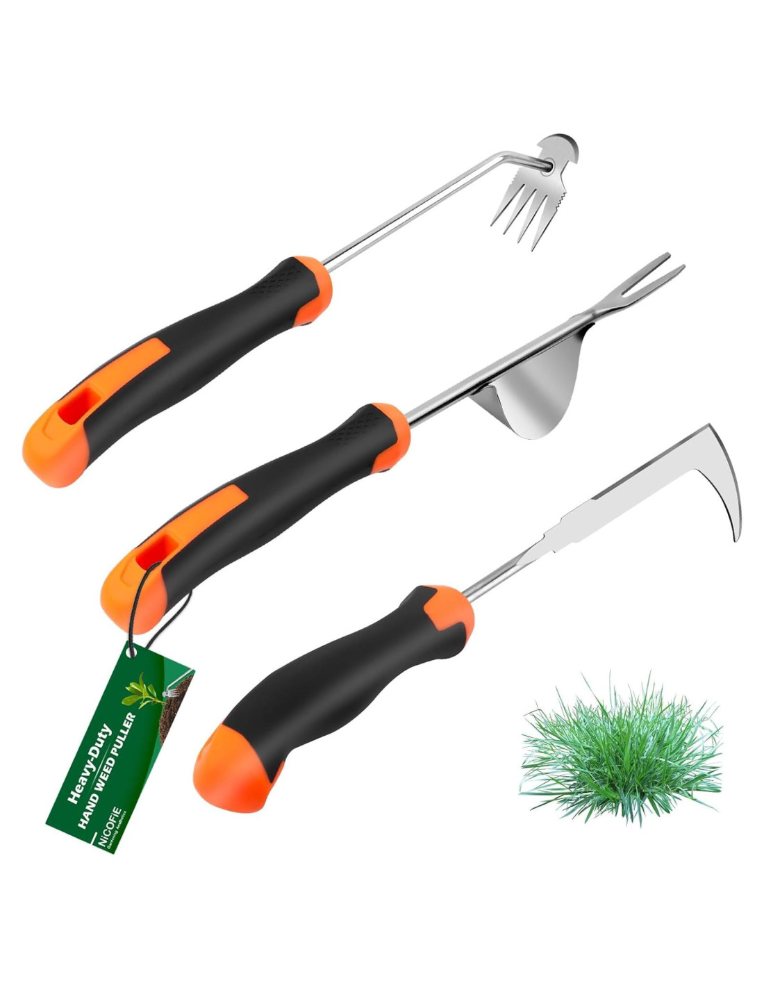 - Kit de herramienta para desmalezar: Este conjunto de herramientas de desmalezado contiene 3 herramientas para quitar hierba: (1) Hoz de desmalezado en forma de L: Corta maleza en hendiduras, aceras y otros; (2) Desmalezadora manual en forma de V: Cava y levanta las raíces aplicando el principio de palanca; (3) Excavadora de maleza de 4 dientes: Perfora en el suelo para cavar las raíces y aflojar el suelo, pala y planta. Este conjunto funciona en la mayoría de los tipos de suelo, especialmente después de una buena lluvia o riego.