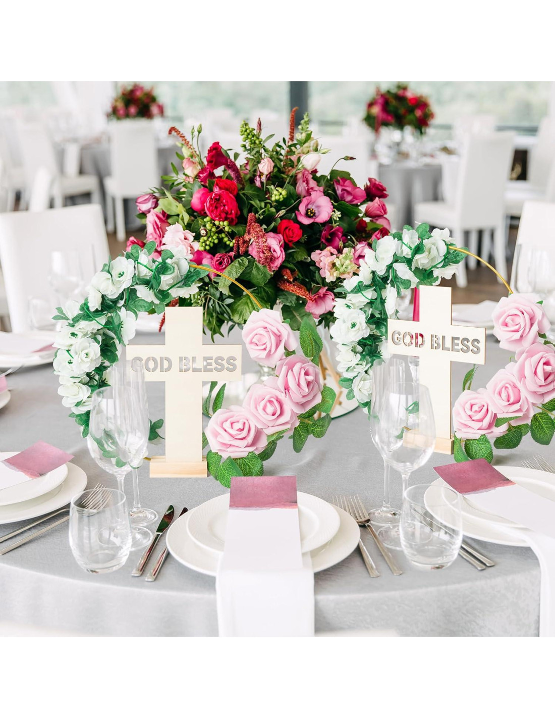 - Decoración de Mesa Exquisita: Recibirás cruces de texto caladas*12, rosas simuladas rosadas pálidas*25 y hojas*12, enredaderas de rosas blancas pequeñas de 250 cm*3, bases de madera*12, anillos dorados*12, hojas de adhesivo punteado*2.