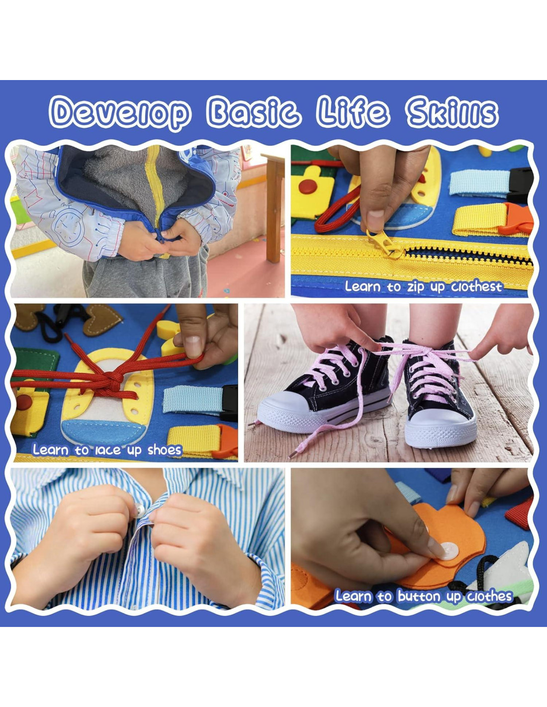 - Juguetes Educativos para Niños Pequeños: El libro ocupado incorpora habilidades prácticas de la vida como habilidades de vestir con botones, cremalleras y cordones; y Crecimiento Cognitivo como aprender números, colores (10 pegatinas de crayón), animales (9 tipos), reconocimiento de izquierda y derecha, relojes, alfabeto y calendario; promoviendo efectivamente la independencia y las habilidades motoras de los niños pequeños.