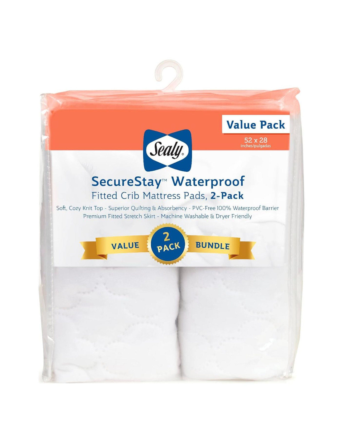 Descripción del producto Las almohadillas para colchones de cuna impermeables Sealy SecureStay vienen en un conveniente paquete de 2, por lo que el colchón de la cuna de su pequeño siempre está protegido de la humedad, derrames y desorden. Estas fundas para colchones cuentan con una parte superior de punto acogedora y acolchado para mantener cómodos a los bebés y niños pequeños. Además, una falda premium SecureStay proporciona un ajuste perfecto en colchones de cuna y colchones para niños pequeños. Del fabricante Sealy Baby ofrece los colchones de cuna más confiables y ofrece colchones para camas de niños seguros, de apoyo y cómodos, cunas para bebés al lado y ropa de cama premium protectora de cuna en la que los padres han confiado durante décadas. Como líder en sueño seguro, comodidad y calidad duradera durante años, más bebés duermen en un Sealy que en cualquier otra marca en los EE. UU. Los colchones de cuna Sealy Baby son probados en firmeza para ayudar a reducir el riesgo de asfixia y proporcionar una superficie de sueño de apoyo. Además, el 100% de los colchones de cuna Sealy Baby son fabricados en América por expertos que ayudan a crear estándares de la industria para garantizar la seguridad y calidad para bebés y niños pequeños. Cada colchón para bebés es no tóxico, certificado por ASTM, certificado por CPSIA y certificado por Greenguard Gold Air Quality para un ambiente de sueño más saludable, probado para bajas emisiones químicas, y están hechos sin productos químicos agresivos para un sueño más seguro. La colección de cunas transpirables, durmientes al lado de la cama, cómodas almohadillas para cambiar pañales y almohadillas protectoras de colchón de cuna hipoalergénicas y de alta calificación de Sealy Baby son esenciales para la guardería y artículos imprescindibles para el registro de bebés que cada nuevo padre desea para su recién nacido. Los padres descansan más tranquilos con una marca confiable, productos de calidad y atención al cliente que siempre está aquí para ayudar a su familia a dormir mejor.