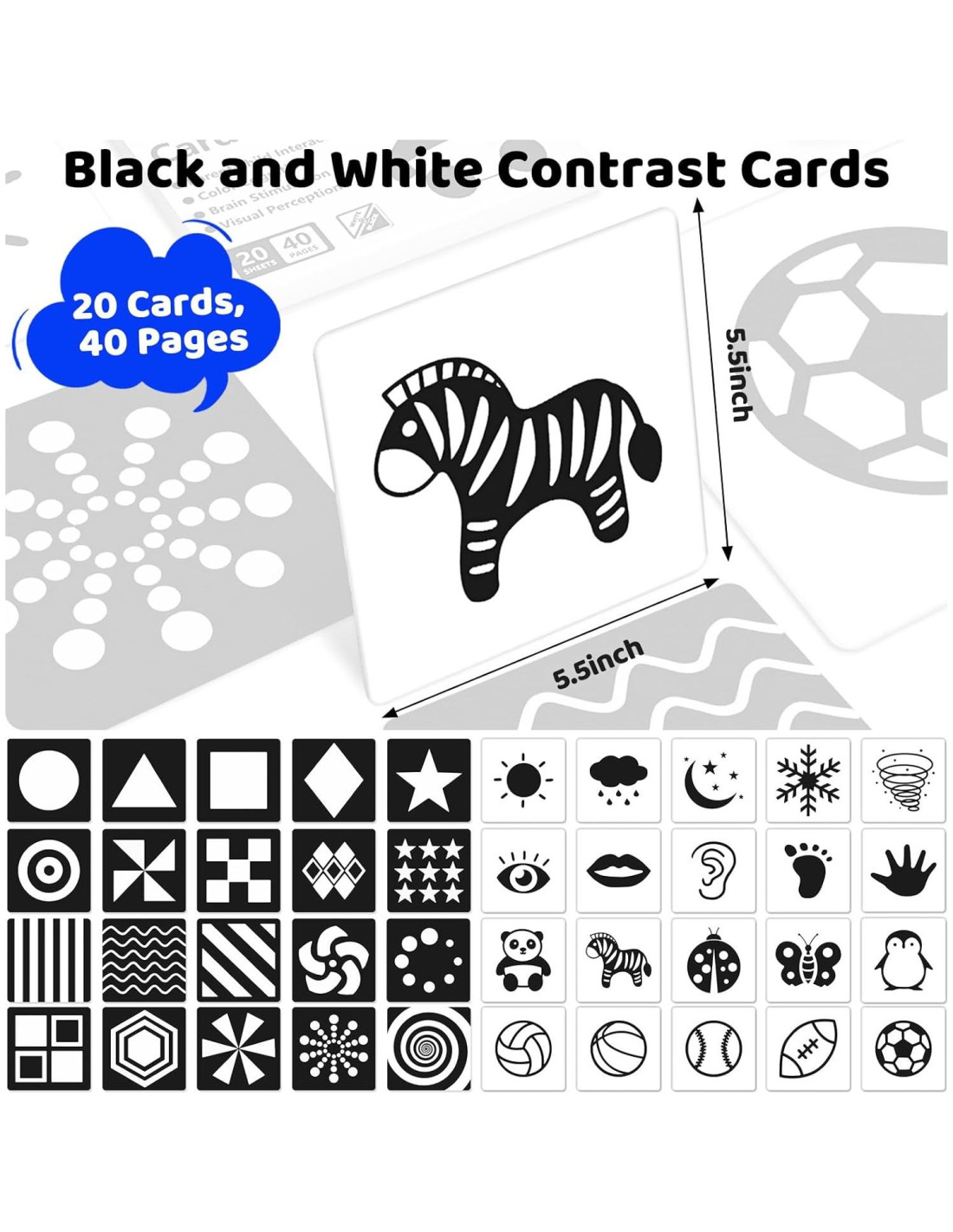 - [Juguetes de Alto Contraste para Recién Nacidos] Este es un juguete de tarjetas de flash de tiempo boca abajo en blanco y negro de alto contraste, es un juguete de alto contraste para recién nacidos, adecuado para bebés de 0-6 meses, este conjunto de tarjetas de alto contraste contiene 20 tarjetas 40 páginas, cada tarjeta de contraste en blanco y negro mide 14 cm x 14 cm, ideal para sostener o colocar en cualquier lugar para mostrar las tarjetas a los bebés, ¡es un gran juguete de alto contraste para recién nacidos!