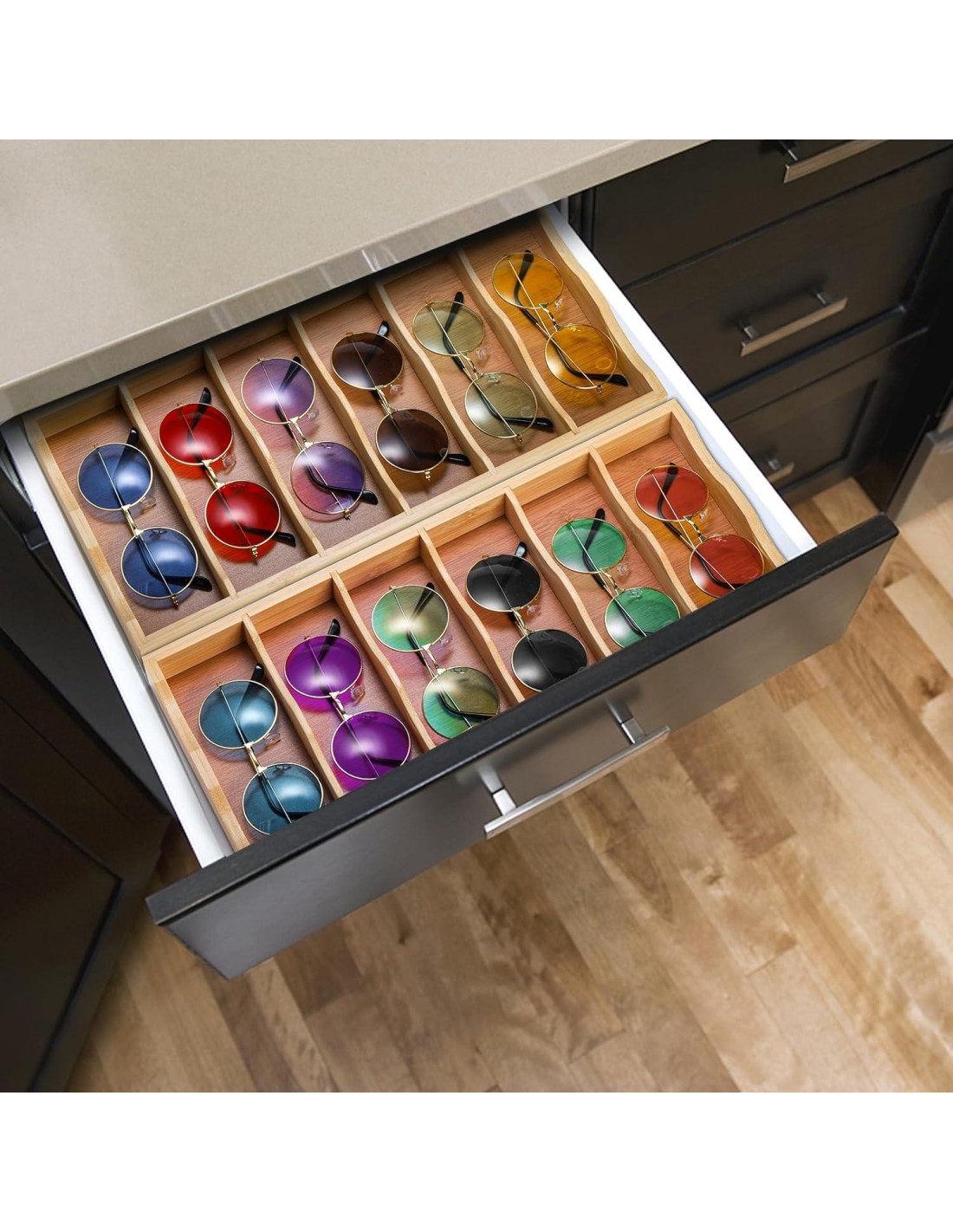 - Paquete: Incluye 3 organizadores de exhibición de gafas de sol, 16"L x 7.7"W x 1.5"H (40,64 cm x 19,56 cm x 3,81 cm), cada compartimento es 7.1"L x 2.4"W x 1.2"H (18,03 cm x 6,1 cm x 3,05 cm), proporciona mucho espacio para una amplia variedad de gafas