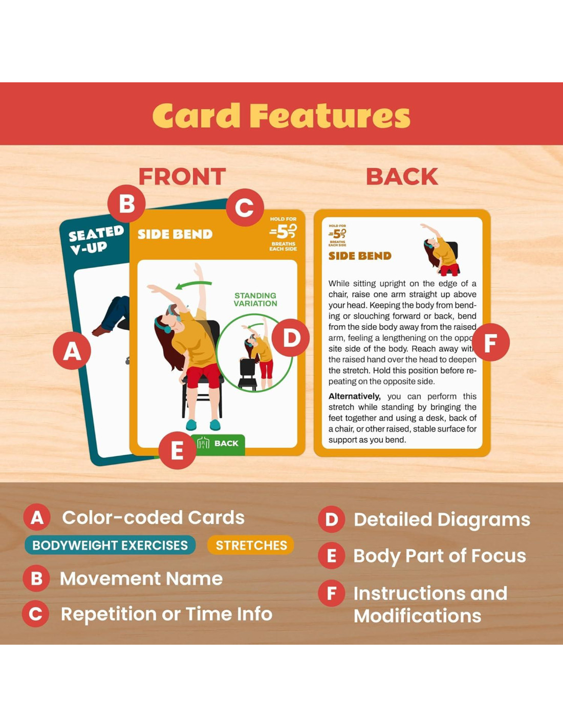 - Diseñado para Todos los Niveles: Estas cartas cuentan con ilustraciones, instrucciones paso a paso, información de repeticiones/tiempo y modificaciones para adaptarse a cualquier nivel de condición física.