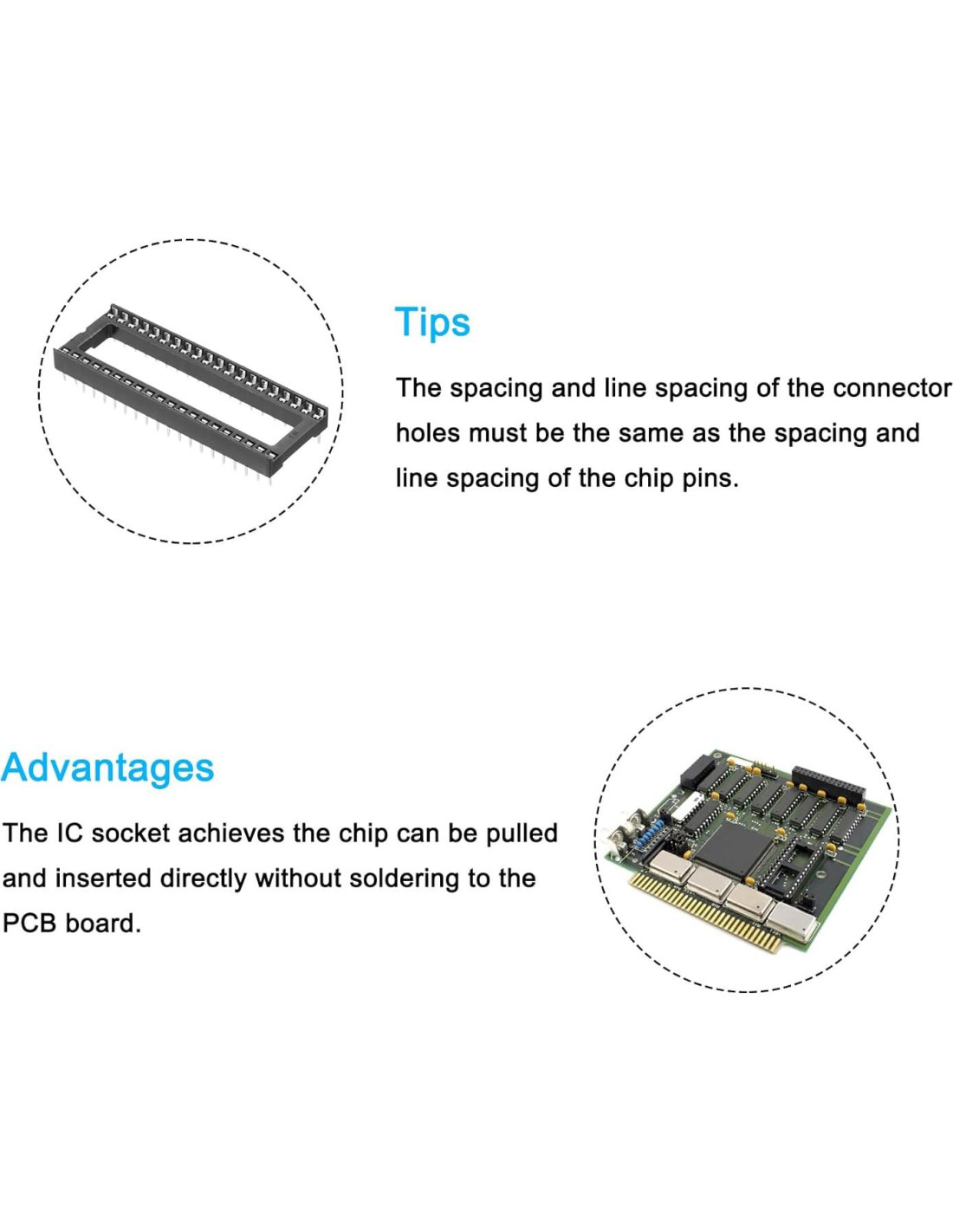 ¿Qué es esto? El Chip IC es una pequeña placa de circuito hecha de materiales semiconductores, que reúne una gran cantidad de componentes electrónicos, y está conectada por cables y líneas metálicas para formar un sistema de circuito completo. ¿Qué recibiré? Paso: 2.54mm / 0.1" (2.54mm) Número de Pines: 40 Distancia entre Filas: 15.2 mm Material: Plástico, Metal Tamaño Total: 51 x 18 x 8 mm / 2" x 0.7" x 0.31" (L*W*H) Contenido del Paquete: 8Pcs x Adaptador de Zócalo de Chip DIP IC Circuito. ¿Hay alguna ventaja del producto? El zócalo IC permite que el chip se pueda extraer e insertar directamente sin soldadura a la placa PCB. Es resistente al calor y tiene buena estabilidad de pines y puede soportar ensamblajes y desensamblajes repetidos sin dañar el chip. ¿Cómo usarlo? El zócalo IC es el portador entre el chip y la placa de circuito PCB, el chip se puede extraer e insertar directamente sin soldadura a la placa PCB. ¿Qué debo tener en cuenta? El espaciado y la separación de las agujeros del conector deben ser los mismos que el espaciado y la separación de los pines del chip.