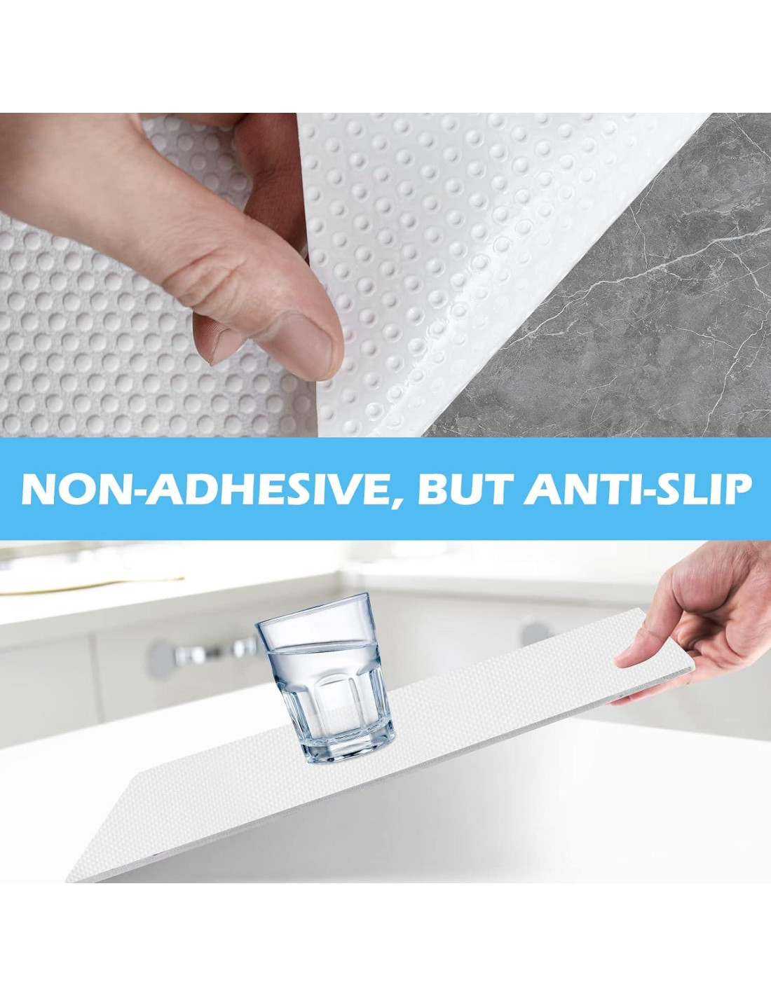 - [NO ADHESIVO, PERO ANTIDESLIZANTE] Los forros para cajones están diseñados con una superficie antideslizante ligeramente texturizada en un lado, lo que les da un buen efecto antideslizante, evitando eficazmente que los artículos se muevan en los cajones o estantes de los armarios, y una superficie lisa no adhesiva en el otro lado, lo que facilita su extracción más tarde, asegurando que no quede pegamento residual en los forros de cajón después de su uso, por lo que puedes usarlos en casi cualquier espacio de tu hogar, incluidos refrigeradores, armarios, closets, fregaderos, etc.