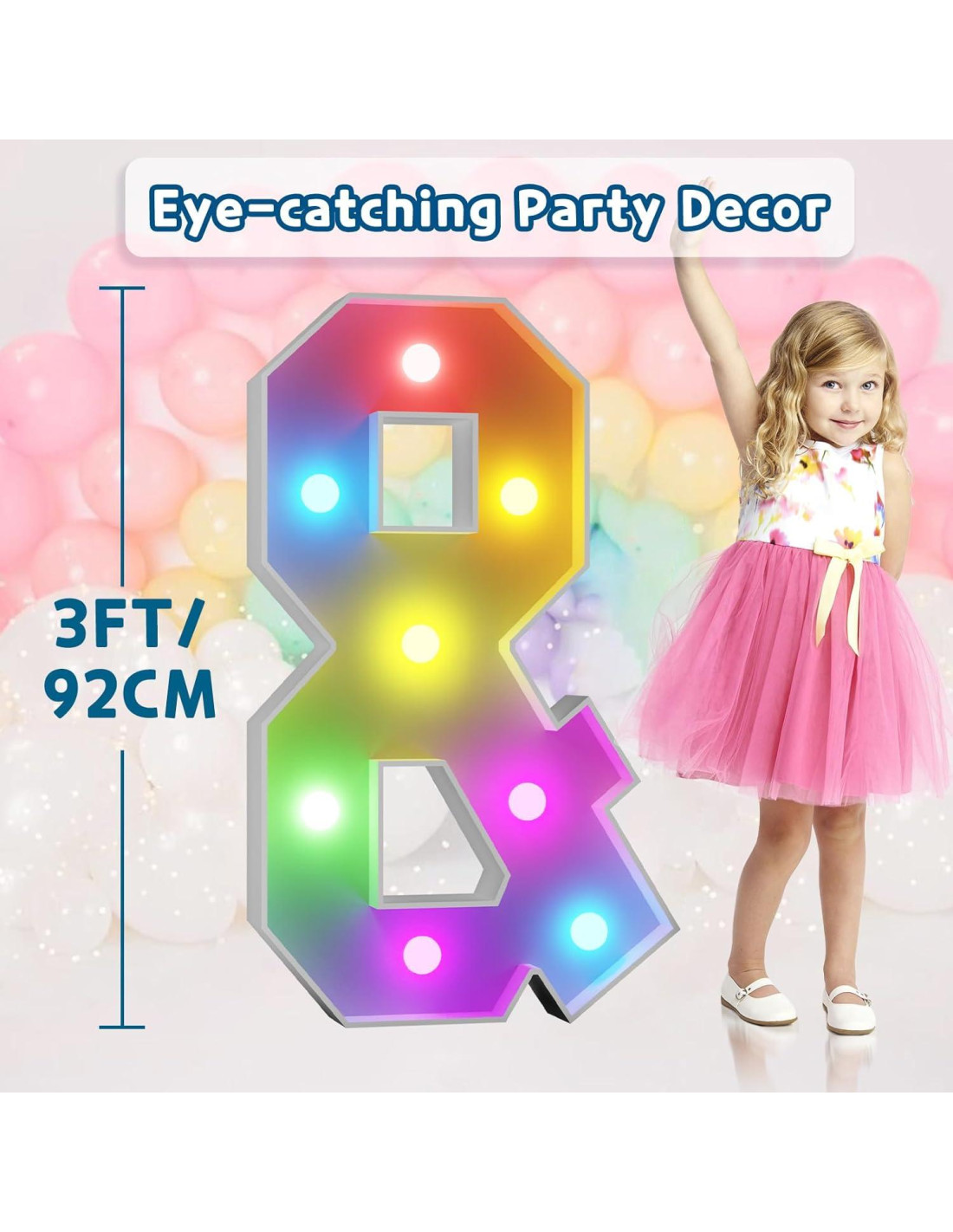 - Ambiente de Fiesta Único. Haz que tu fiesta sea verdaderamente inolvidable con grandes números iluminados, que son perfectos para crear una atmósfera de fiesta inmersiva, pero también son un artículo imprescindible para tomar fotos únicas y memorables.