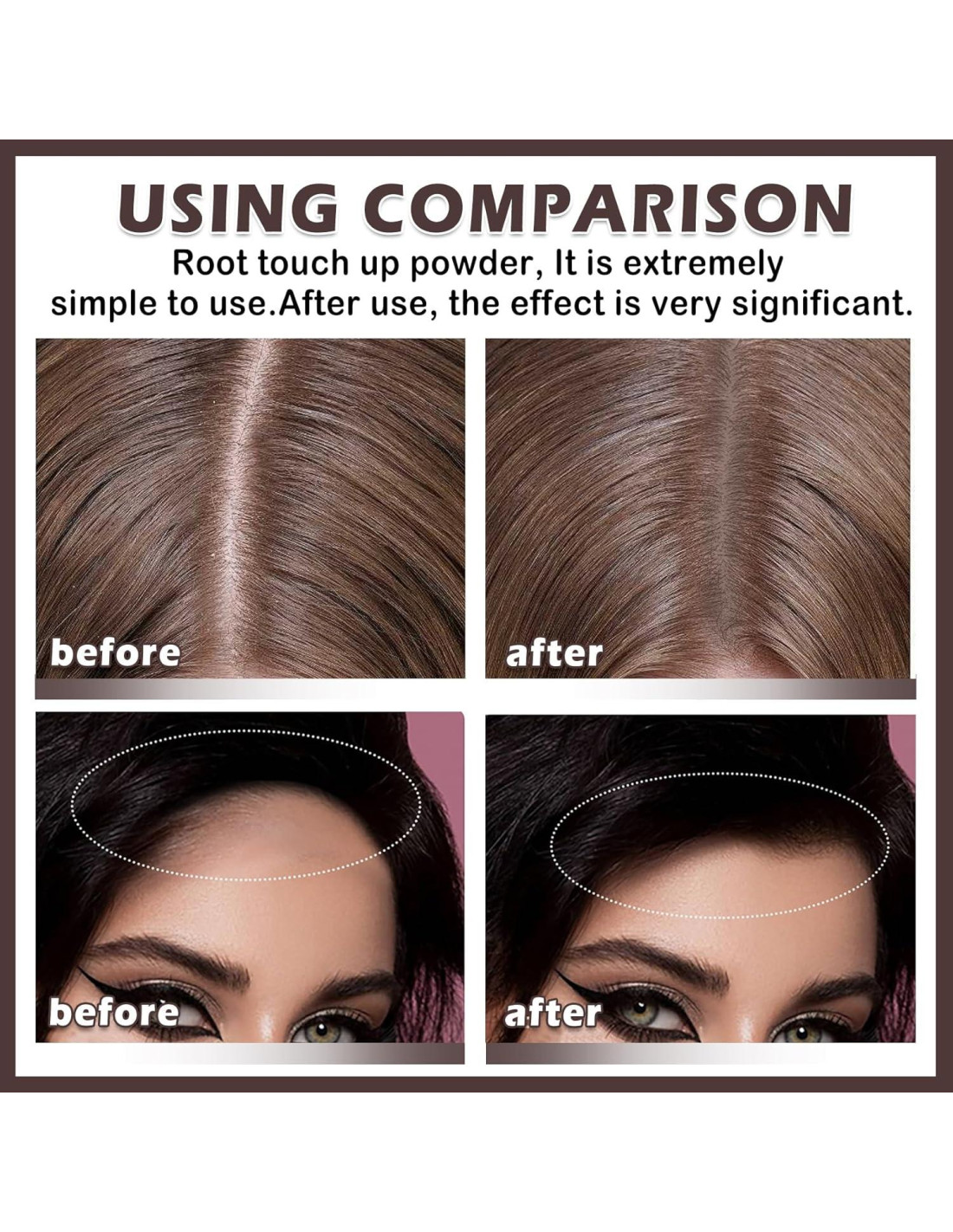 -El polvo para línea de cabello viene en dos colores diferentes: castaño oscuro, castaño claro, amarillo dorado y negro. Puedes elegir un color que te guste o que esté cerca de tu cabello. -El polvo para cubrir raíces cubre el cabello gris en la raíz, la calvicie o la línea de cabello en retroceso, puede ocultar fácilmente el cabello fino y hacer que tu cabello se vea más grueso. -El polvo para retoque de raíces también se puede usar como polvo para cejas para rellenar tus cejas.