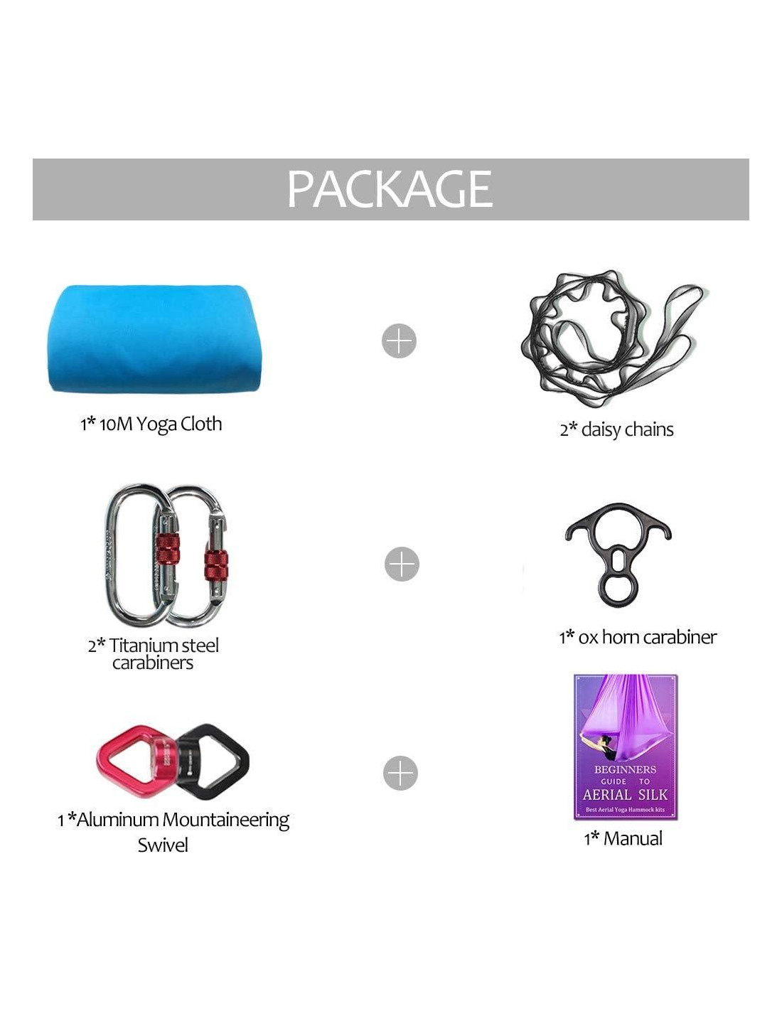 - Material: 100% nylon 40-Denie Tricot con un poco de elasticidad, transpirable, suave y cómodo. Tamaño: 10m x 2.8m (LxW), Capacidad de Carga: 2000 lbs (900kg), Recibirás: 1 x Tela de Yoga de 10M, 2 x ANILLOS en O para colgar (capacidad de carga: 25KN/5600LBS), 2 x cadena de margarita para extender (105cm*1.5cm), 1 x Giratorio (fuerza máxima: 30KN/6744lbf), 1 x GANCHO de cuerno de buey (32 KN/7194lbf), 1 x Manual.