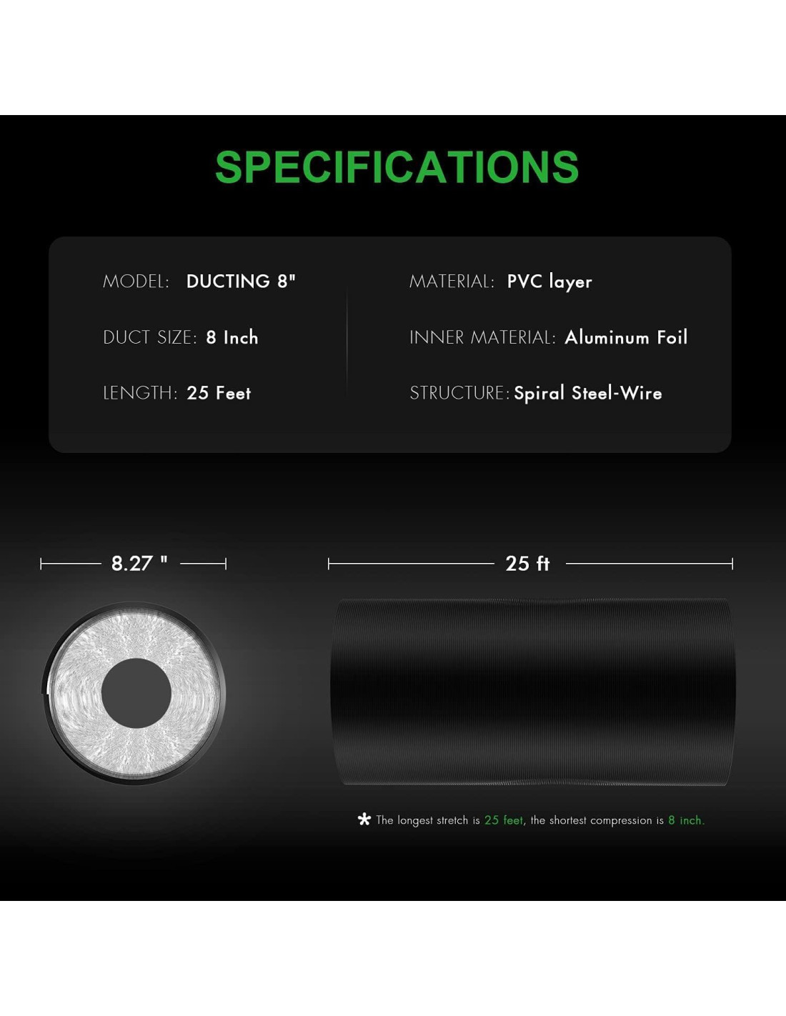 - Especificaciones: tamaño del conducto: 8 pulgadas; longitud: 25 pies; material: PVC termoplástico; material interior: papel de aluminio. Rango de temperatura: -22F~212F(-30C~100C)