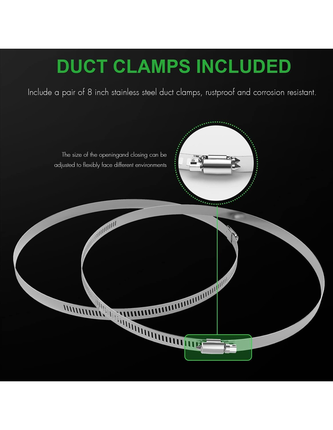 - Material premium: aluminio de alta calidad, resistente a altas temperaturas y a la corrosión, duradero. Capa gruesa de PVC en este conducto puede prevenir filtraciones de luz. Incluye un par de abrazaderas de conducto de acero inoxidable de 8 pulgadas