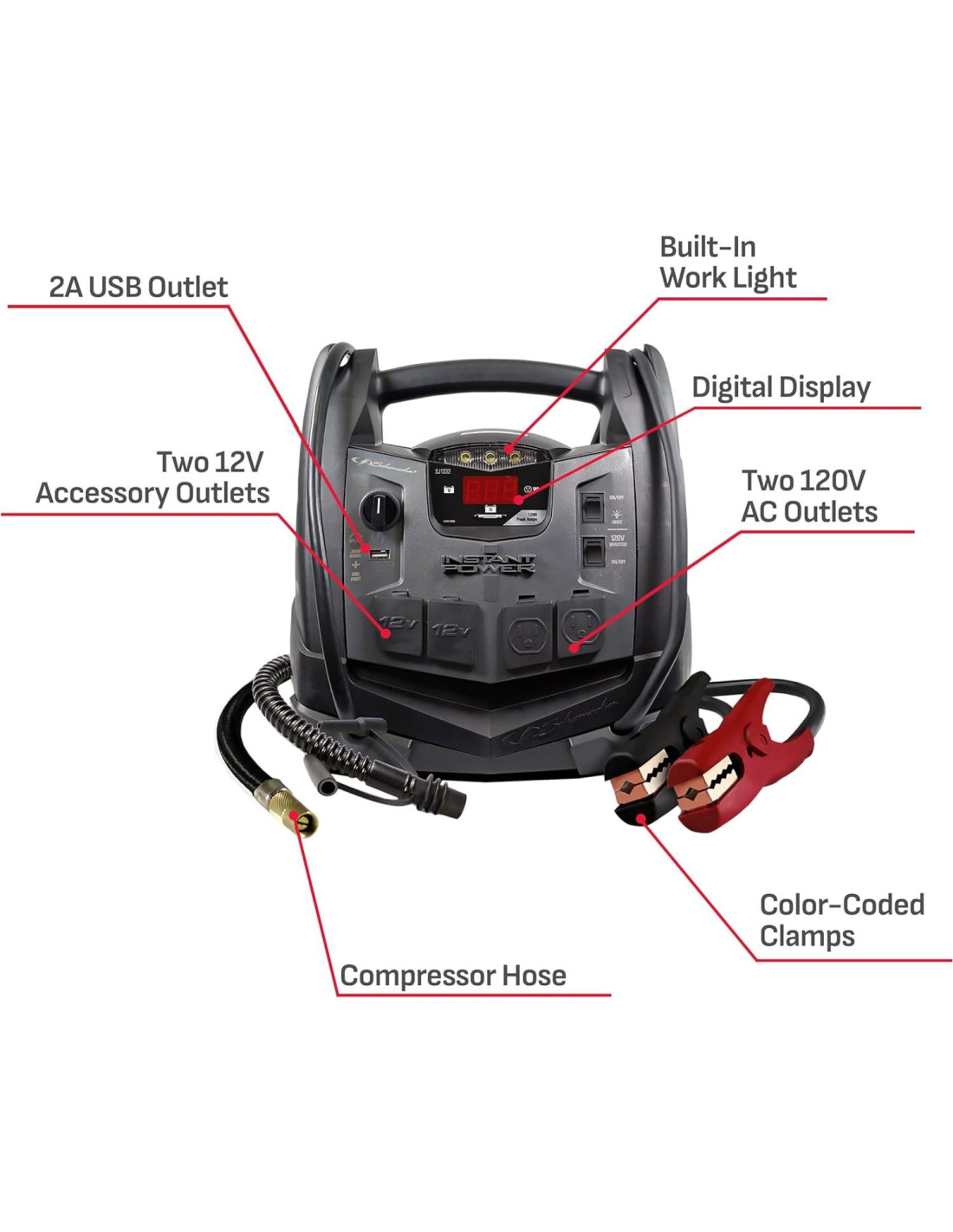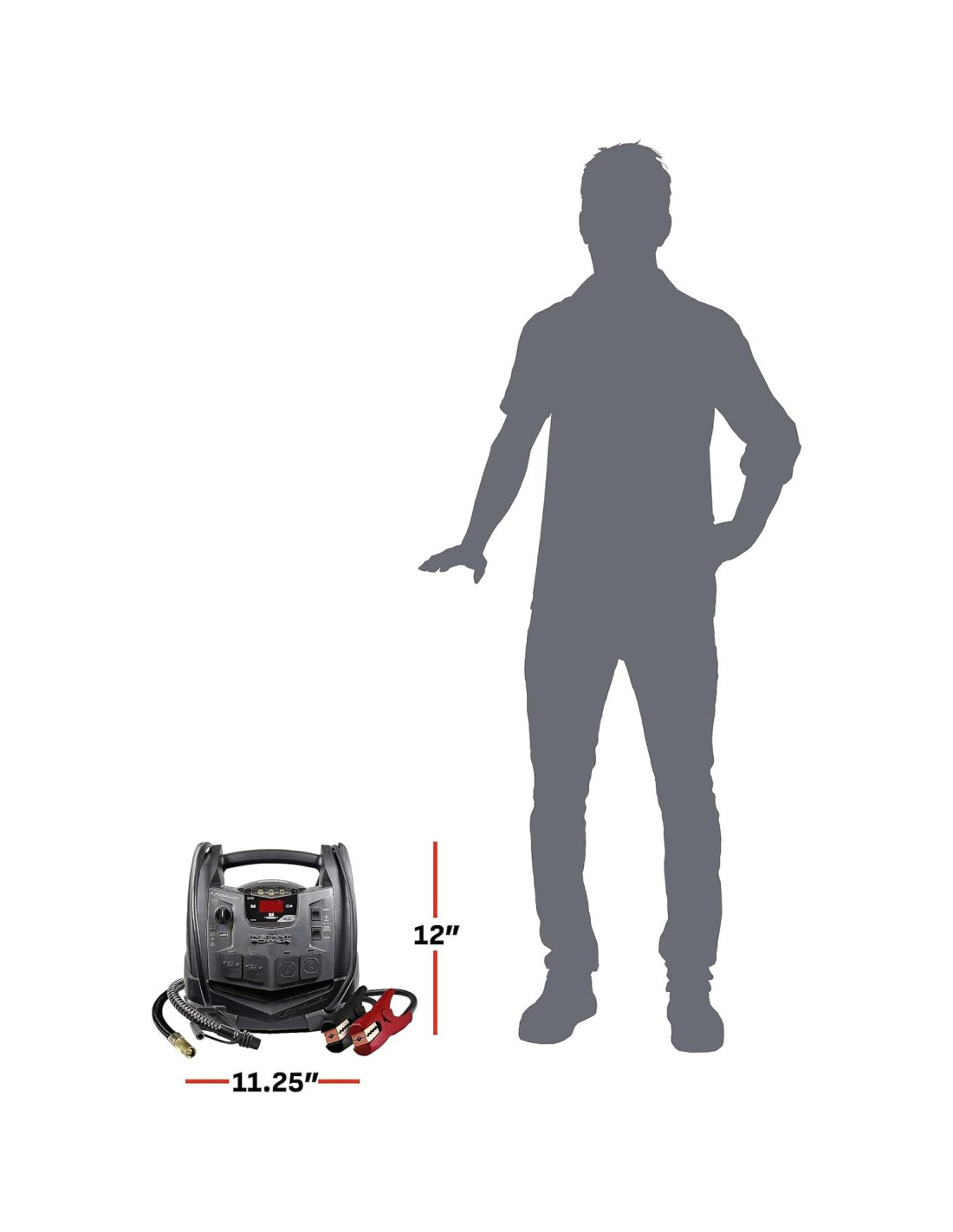 - Preparación para Emergencias: Con el dispositivo 6 en 1 Schumacher SJ1332 puedes superar una variedad de emergencias con las funciones de arrancador de salto, estación de energía portátil, inversor de potencia, compresor de aire, inflador/desinflador y luz de trabajo