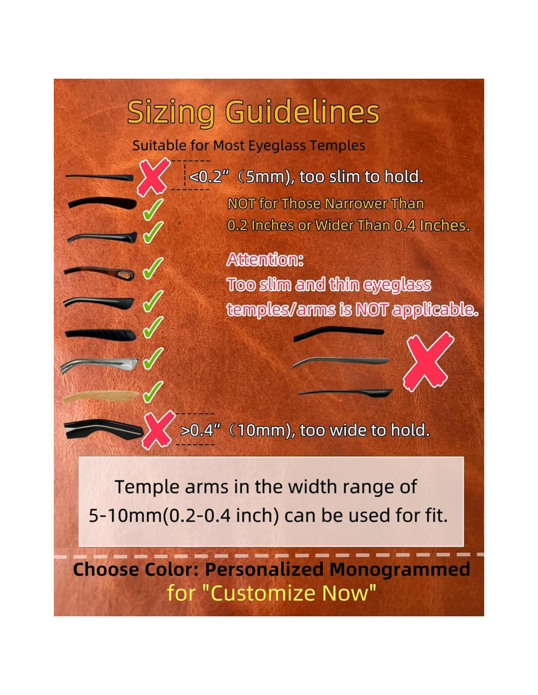 - Correa Retenedora de Gafas de Cuero de Ajuste Universal: Adecuada para la mayoría de las gafas de sol, gafas de vista, gafas de lectura o gafas recetadas; No adecuada para patillas más estrechas que 0.2" (0,51 cm) o más anchas que 0.39" (0,99 cm); La correa de gafas de sol deportiva tiene una longitud de aproximadamente 23.8" (60,45 cm)