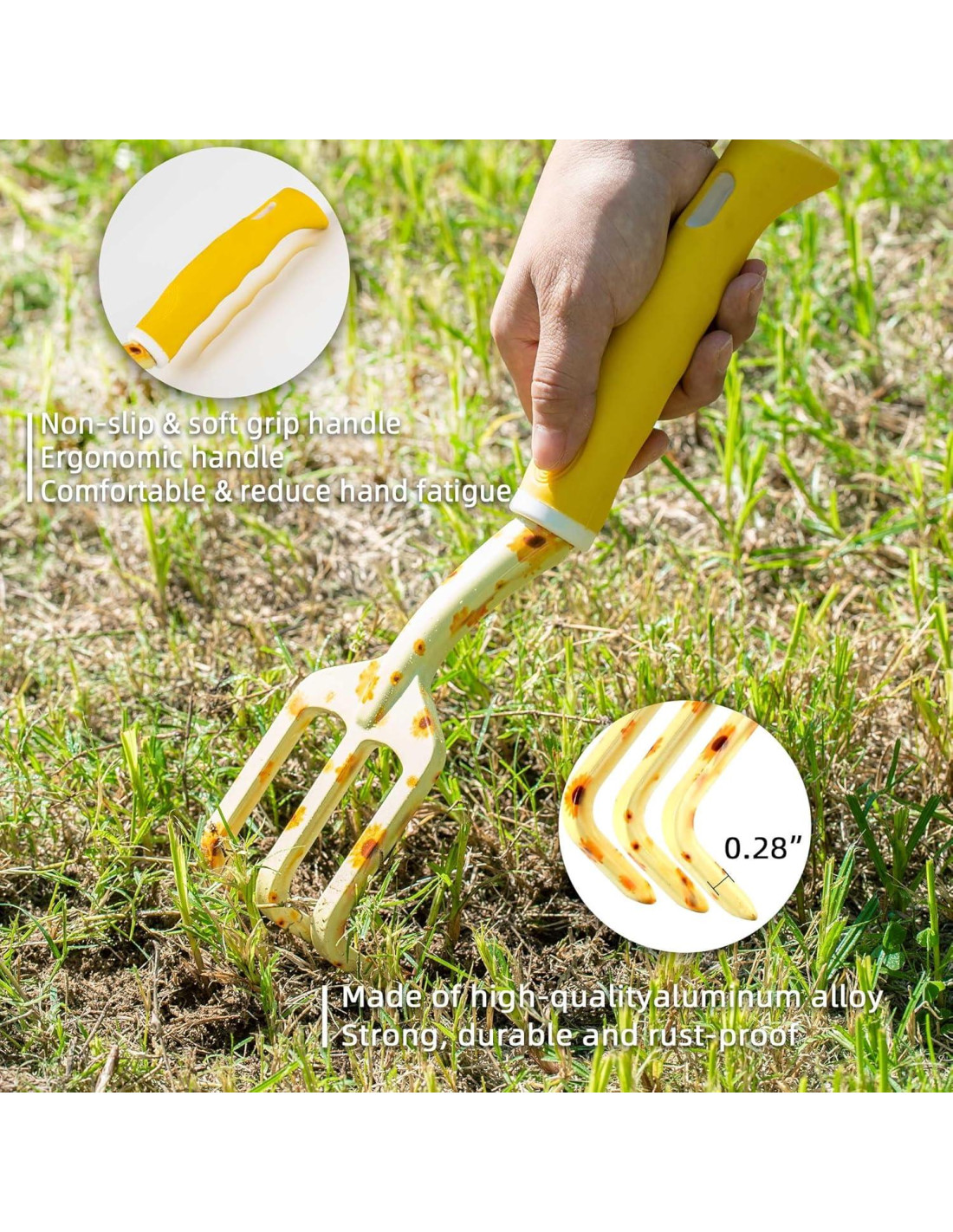 - Materiales Duraderos de Alta Calidad - Herramienta de jardinería de mano, con un peso satisfactorio, materiales y sensación de calidad. Hecho de aleación de aluminio fundido de alta resistencia, fuerte y duradero, con alta dureza, sin necesidad de preocuparse por el óxido y la rotura. Los mangos ergonómicos de goma reducirán el estrés y la fatiga de tus manos, y los prácticos agujeros para colgar en el mango son fáciles de almacenar.