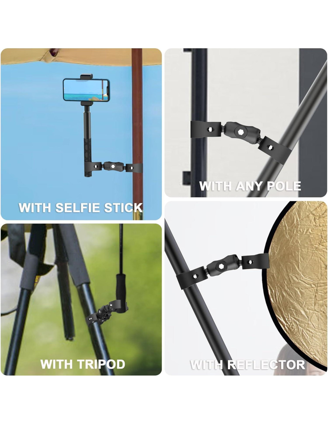 - [Opciones de Montaje Versátiles] El sistema de doble abrazadera funciona en trípodes, escritorios, barandillas, estantes (interiores/exteriores). Úselo horizontalmente como soporte de travesaño o verticalmente como extensión de brazo de grúa.