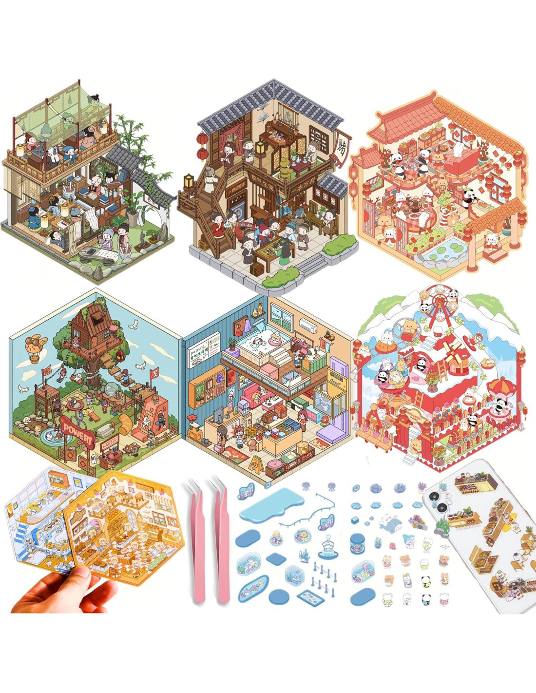 - [Pegatinas de escena DIY en 3D] El conjunto de pegatinas incluye 2 pinzas y 6 temas: Hospital de Mascotas, Parque de Diversiones Panda, Fiesta Panda, Parque de Aventuras, Academia de Caligrafía, Casino; Mezcla y combina, diseña combinaciones únicas