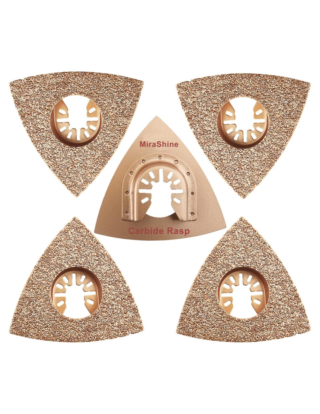 MiraShine 5Pcs Herramienta de Eliminación de Lechada Triangular Nuestras hojas de raspado oscilantes tienen un diámetro de 3-1/8 pulgadas (7.94 cm) en forma triangular, ideales para entrar en esquinas estrechas y áreas restringidas. Estas hojas de eliminación de lechada son perfectas para lijar, moler, raspar, eliminar lechada de albañilería, mortero, adhesivos y productos de madera Accesorios de hojas de sierra de multiherramienta oscilante MiraShine de liberación rápida y universal, compatibles con numerosos modelos de herramientas oscilantes en el mercado, tales como: Chicago Electric 60428 8-Funciones, Chicago Electric Pro Series, Chicago Electric Multi Tool-63113, Craftsman 2.0 Amp No. 320.23465, Crafsman Nextec Mult Tool, Dewalt Inalámbrico, Dewalt DCS355, Dewalt DWE315, Dremel Velocity 7.0 Amp Cableado, Dremel MM40, Dremel MM45, Dremel MM50, Dremel VC60-01 (adaptador incluido), Fein Multimaster FMM250Q, Harbor Fright 63113, Jobmax, Makita Inalámbrico 18V, Makita LXMT02, Makita TM3000G, Makita XMT03Z, Milwaukee M12, Milwaukee 18, Milwaukee Fuel Multi Tool 18V; Nextec; Herramienta Oscilante Porter Cable 20V, Porter Cable PCC510 / PCC710 / PCE 605 / PCE605K / PCE606 / PCE606K; Ridgid Jobmax Herramienta Oscilante, Ridgid R2820-serie B, Ridgid R2820-serie B, Ridgid R286024 AMP Cableado, Ridgid R8620-Serie, Ryobi Inalámbrico, Ryobi P340 ONE Plus 18V, Rockwell RK5132K 3.5 Amp, Rockwell RK5151k, Rockwell Shop Series SS5122, Sonicrafer de Rockwell, Bosch PS50BN, Bosch MX30 / GOP300SCE / GOP18VEC (adaptadores incluidos), Wen 2312, Worx WX682L.9, Zinsano MT400. NOTA IMPORTANTE NO es compatible con los siguientes modelos: - Black and Decker Matrix - Bosch MXH180B, Bosch GOP40-30, Bosch GOP12V-28N, BoschStarlock - Modelos Dremel 6300 - Fein Multimaster FMM350QSL, Fein Supercut, FeinStarlock - Modo Craftsman Bolt-On