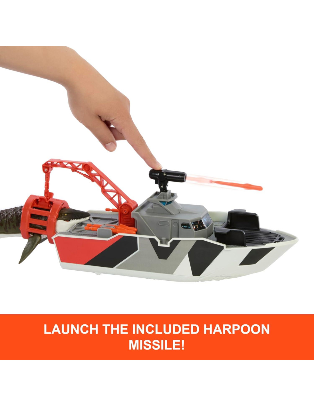 - El barco de 12.5 pulgadas (31.75 cm) presenta detalles realistas como un cabrestante funcional que puede engancharse al Mosasaurus de 13 pulgadas (33 cm) incluido. Ten cuidado con su mandíbula y aletas en movimiento mientras se enrolla a bordo