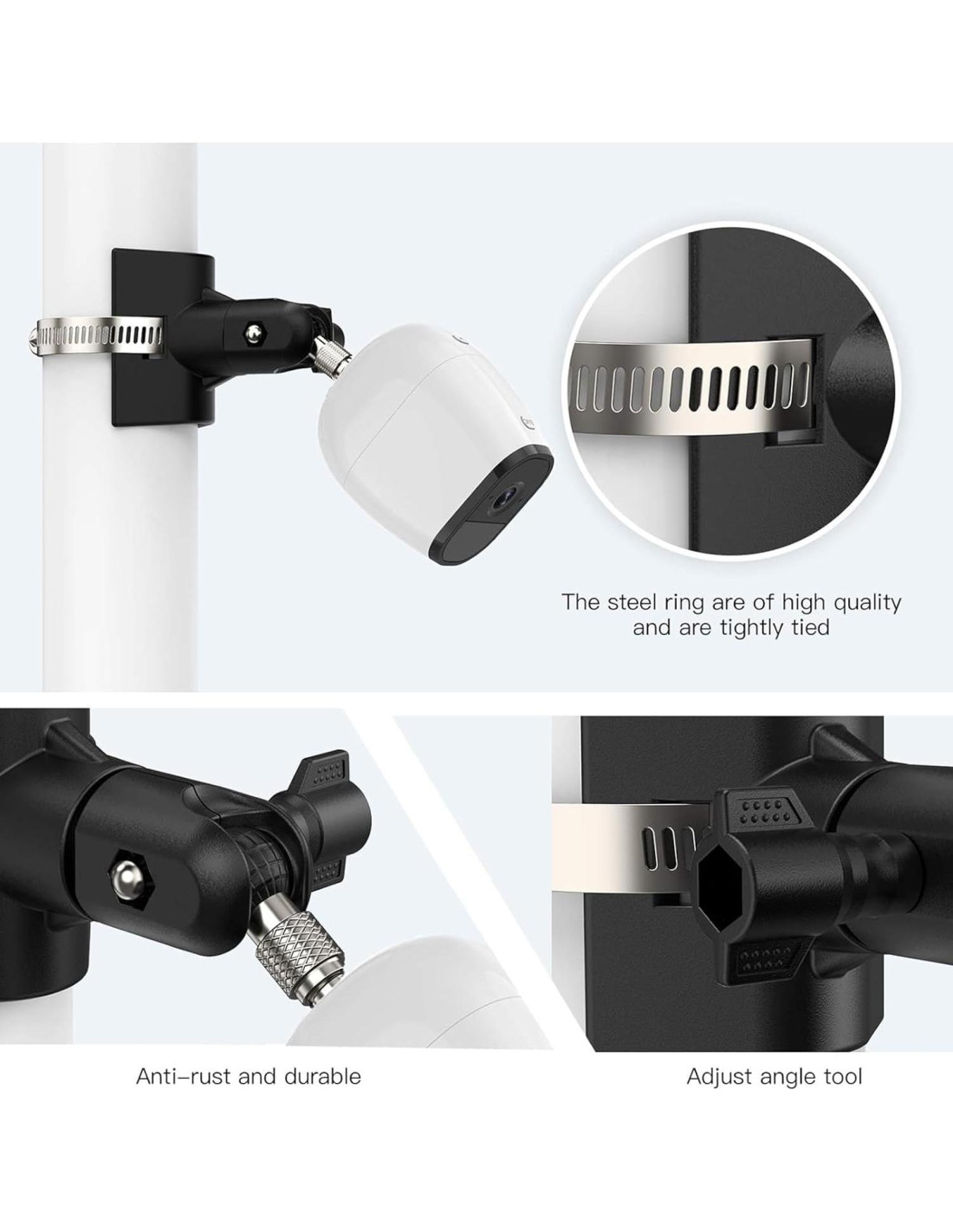 Nuestro soporte para cámara en poste es un cambio de juego para tu configuración de cámara de seguridad. Compatible con Ring Stick Up Cam Pro Battery, Stick Up Cam Pro Plug-In, Stick Up Cam Pro Solar, Stick Up Cam Battery, Stick Up Cam Plug-In, Stick Up Cam Solar, Spotlight Cam Plus Battery, Spotlight Cam Plus Solar, Spotlight Cam Pro Battery, Spotlight Cam Pro Solar. NOTA: No compatible con versiones Plug-In y con cable de las cámaras Ring Spotlight, Blink Outdoor 4, Blink Outdoor (3ra Generación), Blink Mini 2, EufyCam 3 (S330), EufyCam 3C (S300), EufyCam 2C Pro, EufyCam 2C, EufyCam 2 Pro, EufyCam 2, SoloCam S220, SoloCam C210, Google Nest Cam (exterior o interior, batería), Wyze Cam v4, Wyze Cam v3, Wyze Cam v3 Pro, Wyze Cam Pan v3, Wyze Battery Cam Pro. NOTA: No compatible con Wyze Cam OG, Arlo Ultra 2, Arlo Pro 5S 2K, Arlo Pro 4, Arlo Essential 2K, Arlo Essential Spotlight, Arlo Go 2, Cámara Exterior Simplisafe, Reolink Argus 4 Pro, Argus 4, Argus 3E, Argus 3 Ultra, Argus 3 Pro, Argus 3, Cámara Reolink Lumus, TP-Link Tapo C425, Tapo C420, Tapo C410, Tapo C402, Tapo TC85, Tapo TC82 y compatible con otras cámaras de seguridad inteligentes para exteriores que tengan un agujero de tornillo roscado estándar de 1/4"-20. Instalación Versátil: Es una opción conveniente para montar cámaras de seguridad exteriores sin necesidad de perforar agujeros. Se puede adjuntar fácilmente a postes, bajantes, cercas o árboles. Ofrece una vista de vigilancia perfecta mientras que nuestro diseño a prueba de óxido permite una alta instalación, reduciendo el daño potencial causado por personas y prolongando la vida de tu cámara. Características Ajustables: Viene con 4 abrazaderas de banda de acero inoxidable de diferentes tamaños (5.08 cm, 10.16 cm, 15.24 cm y 20.32 cm de diámetro) que se pueden conectar de extremo a extremo. Esto permite que se ajuste a postes redondos o cuadrados que van de 5.08 a 43.18 cm de diámetro. También cuenta con un bloqueo de ángulo firme y seguro para mantener tu cámara estable en la posición deseada. Colocación Flexible: Con un giro de 360 grados y una inclinación de 180 grados, puedes ajustar sin esfuerzo la cámara para obtener ese ángulo de visión ideal. Calidad y Diseño: El soporte para poste está hecho de materiales metálicos de alta calidad, ofrece durabilidad y un rendimiento estable. Su diseño compacto y ligero lo hace muy conveniente de instalar. Este soporte de montaje en el techo es ideal para la instalación de cámaras de seguridad con ángulos de instalación ajustables (Por favor nota: Cámaras no incluidas).