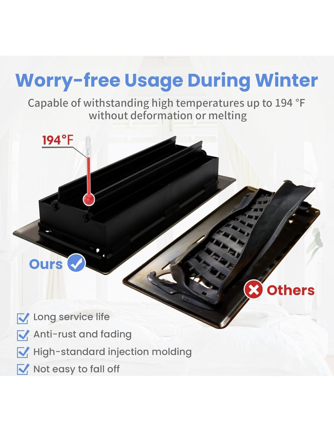 - Instalación y Ajuste Perfecto: El diseño de borde plegado asegura un ajuste sin costuras con su piso, previniendo peligros de tropiezo. No se requieren herramientas ni tornillos, solo mida su conducto y pida el tamaño correcto para una fácil instalación