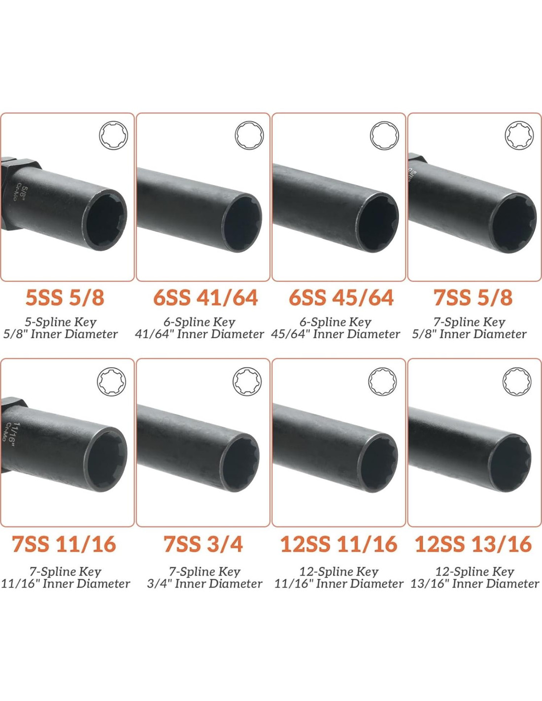 - MÚLTIPLES TAMAÑOS: 8 Tamaños de Diámetro Interno de Puntas. 12 puntas de 13/16 pulgadas (2.06 cm), 12 puntas de 11/16 pulgadas (1.74 cm), 7 puntas de 3/4 pulgadas (1.90 cm), 7 puntas de 5/8 pulgadas (1.59 cm), 7 puntas de 11/16 pulgadas (1.74 cm), 6 puntas de 41/64 pulgadas (1.61 cm), 6 puntas de 45/64 pulgadas (1.78 cm), 5 puntas de 5/8 pulgadas (1.59 cm) en un estuche de almacenamiento portátil que proporciona excelente protección y evita la pérdida de llaves de tuercas.