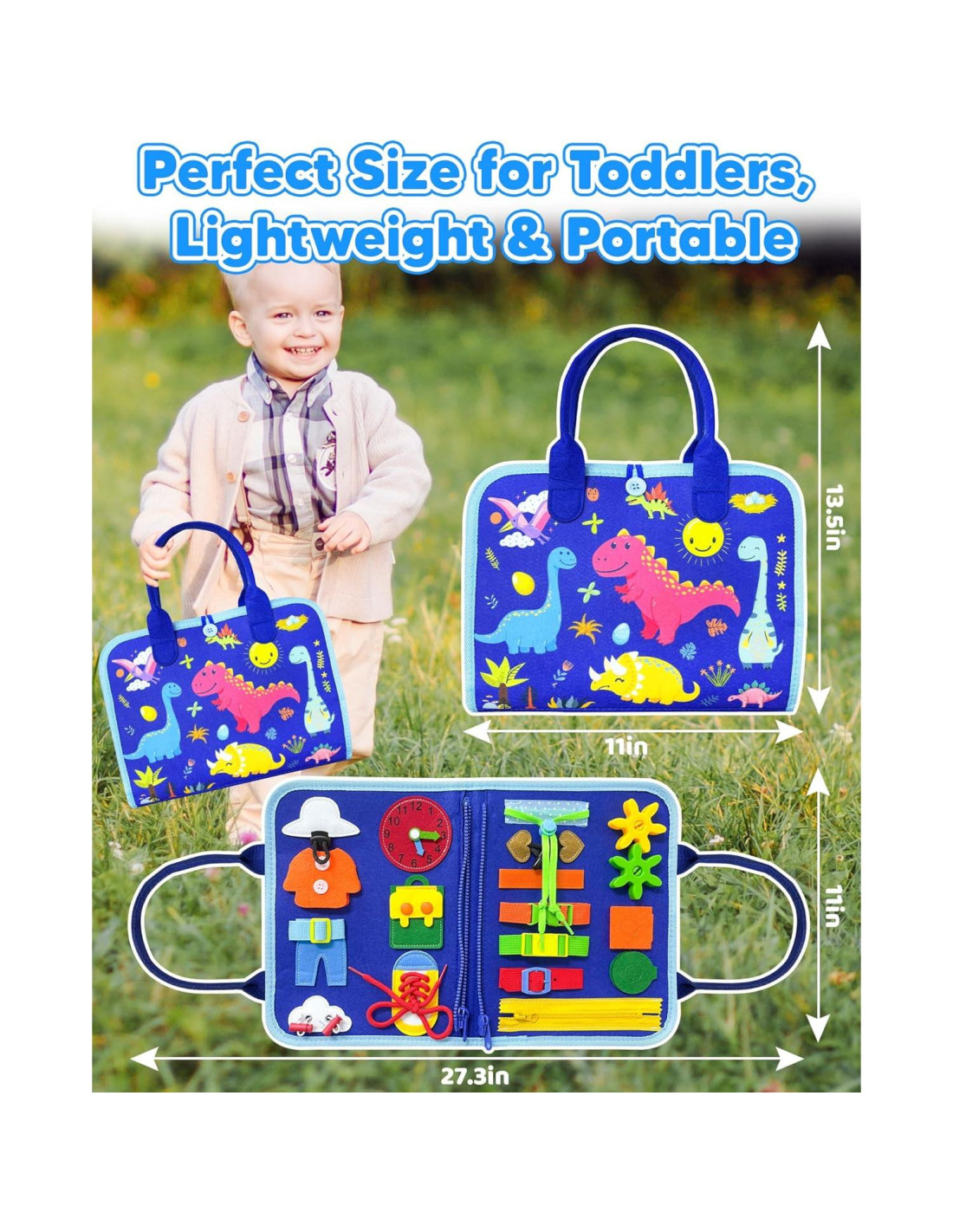 - 8 páginas en 1 Tablero Ocupado: Este libro ocupado de Dinosaurio Azul tiene 8 páginas de actividades y contiene 24 actividades de aprendizaje en habilidades básicas de vestir, letras, números, formas, colores, emparejamiento de animales y un juego de rompecabezas temático de dinosaurios, manteniendo a tus pequeños comprometidos durante mucho tiempo.