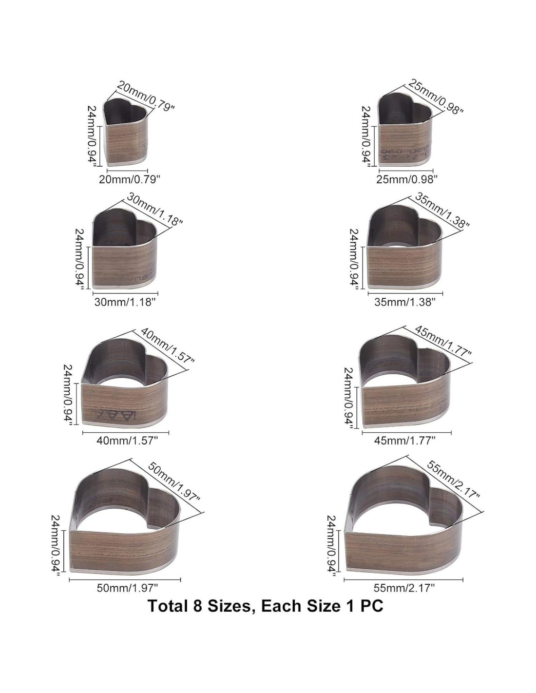 - 8 Tamaños Disponibles: el paquete incluye 8 pcs agujeros en forma de corazón en 8 tamaños diferentes--diámetro 20mm(0.78), 25mm(1), 30mm(1.18), 35mm(1.37), 40mm(1.57), 45mm(1.77), 50mm(2) y 55mm(2.1), cada tamaño 1 pc; grosor 0.71mm.