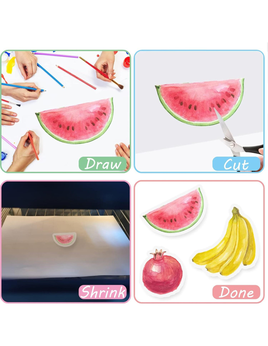 - FÁCIL DE USAR- Simplemente dibuja el patrón en el lado rugoso y coloréalo con crayones, lápices de colores, marcadores. Redúcelo en tu horno y obtendrás una pieza de arte reducida al 20% de su tamaño original ¡todo por ti mismo! Instrucciones completas incluidas en el paquete.