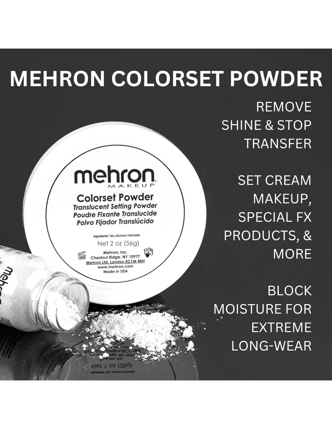 - PROFESIONAL: El Polvo de Fijación Colorset de Mehron es un polvo de maquillaje suelto profesional. Su fórmula super absorbente está diseñada específicamente para absorber aceite y humedad de bases de crema pesadas y productos de efectos especiales como Látex Líquido, Gelatina y Ceras. Grado profesional verdadero, confiado por profesionales de Hollywood y Broadway desde 1927.