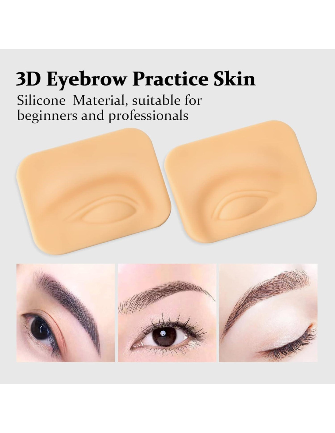 - Nuevo Diseño 3D: El diseño de forma ocular 3D te permite practicar cejas, delineador o tatuajes en formas de ojos más realistas. Viene en empaques individuales para cada 1 par de piel de práctica (con ojos izquierdo y derecho), total 3 pares en el paquete.