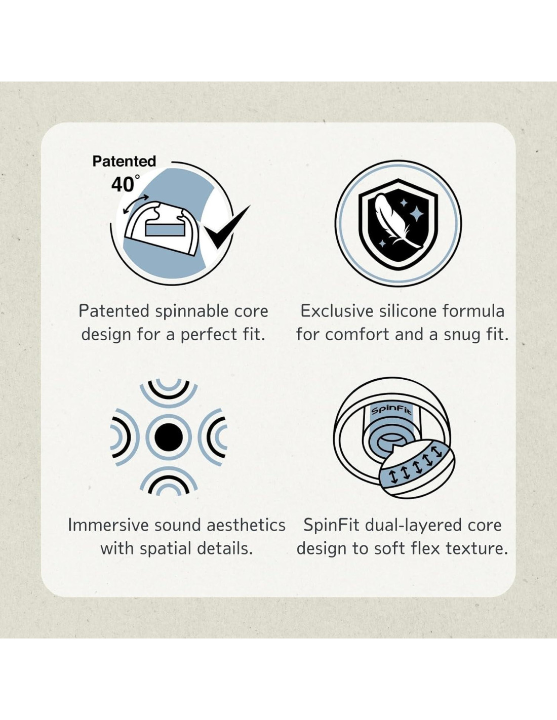 - Eje giratorio 3D patentado de SpinFit que se dobla para adaptarse al ángulo único de los canales auditivos como si fuera personalizado.