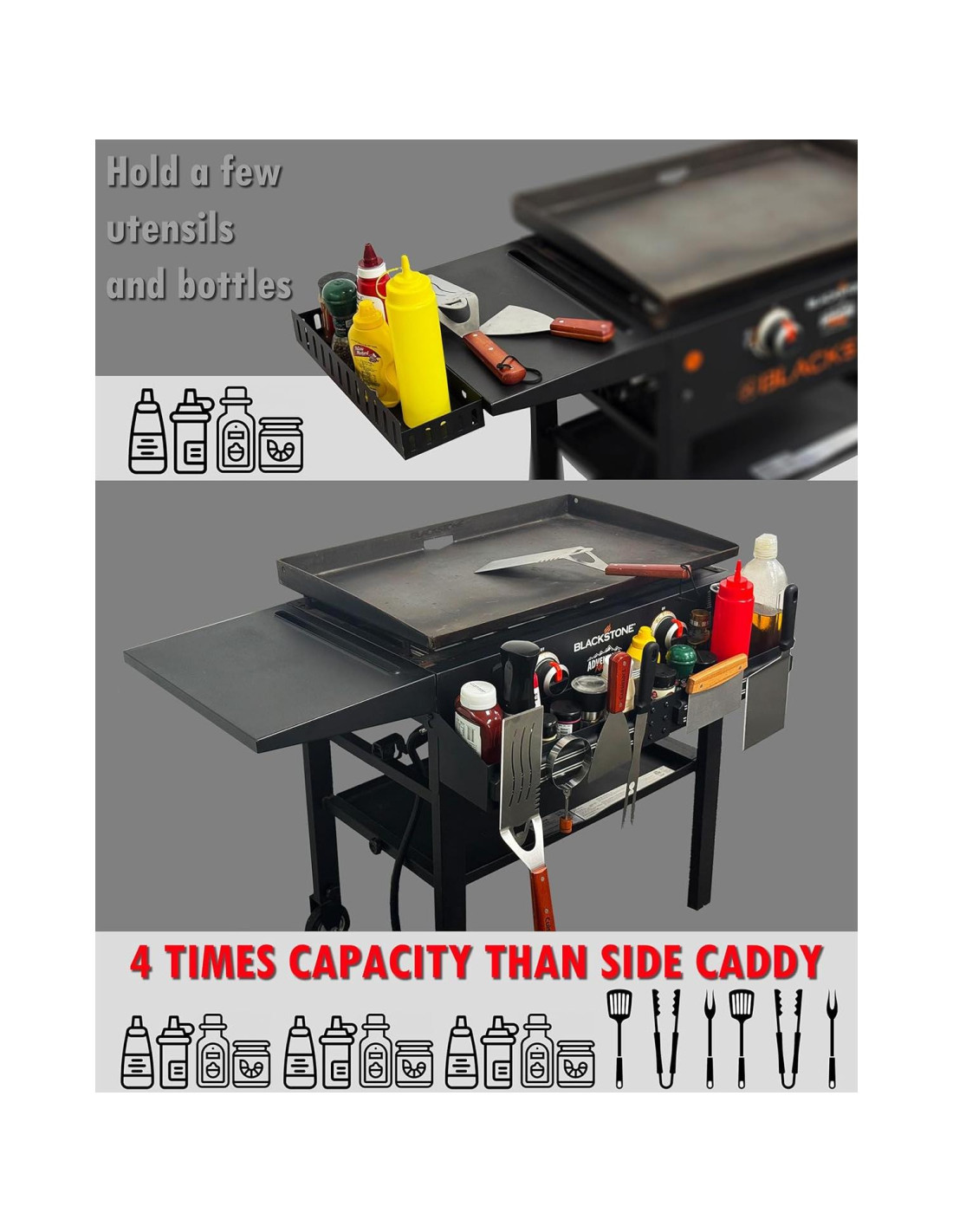 - Caddy Blackstone: ¡Tres veces la capacidad del caddy lateral tradicional de plancha Blackstone! Agrégalo para expandir tu área de almacenamiento, proporcionando amplio espacio en la encimera para colocar botellas y espátulas. Además, los condimentos y raspadores en los caddies laterales tienden a caerse más fácilmente y son difíciles de buscar, este caddy frontal de parrilla Blackstone con 2 barras magnéticas grandes te ayuda a tener acceso fácil y mantener la encimera organizada al mismo tiempo.
