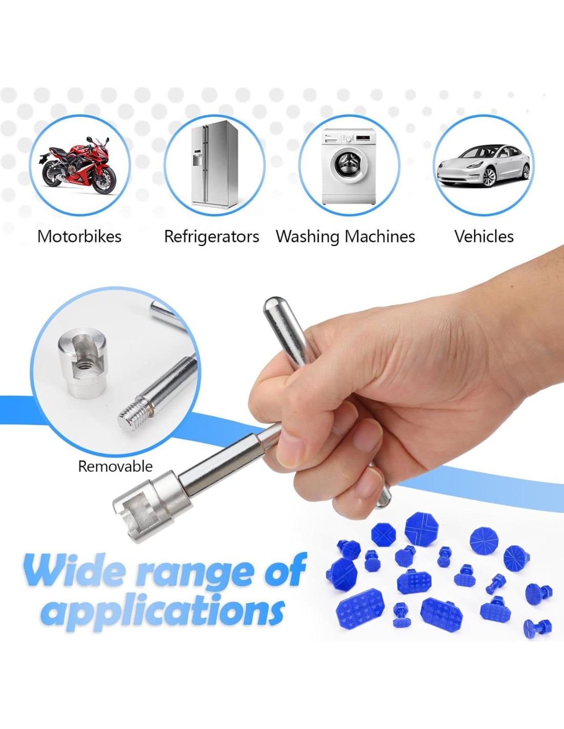 - [Uso universal] El kit de eliminación de abolladuras de coche es perfecto para eliminar las abolladuras de diferentes tamaños causadas por varios factores de impacto. Es adecuado para una variedad de modelos y componentes de coches y también puede servir para refrigeradores, muebles de acero y puertas.