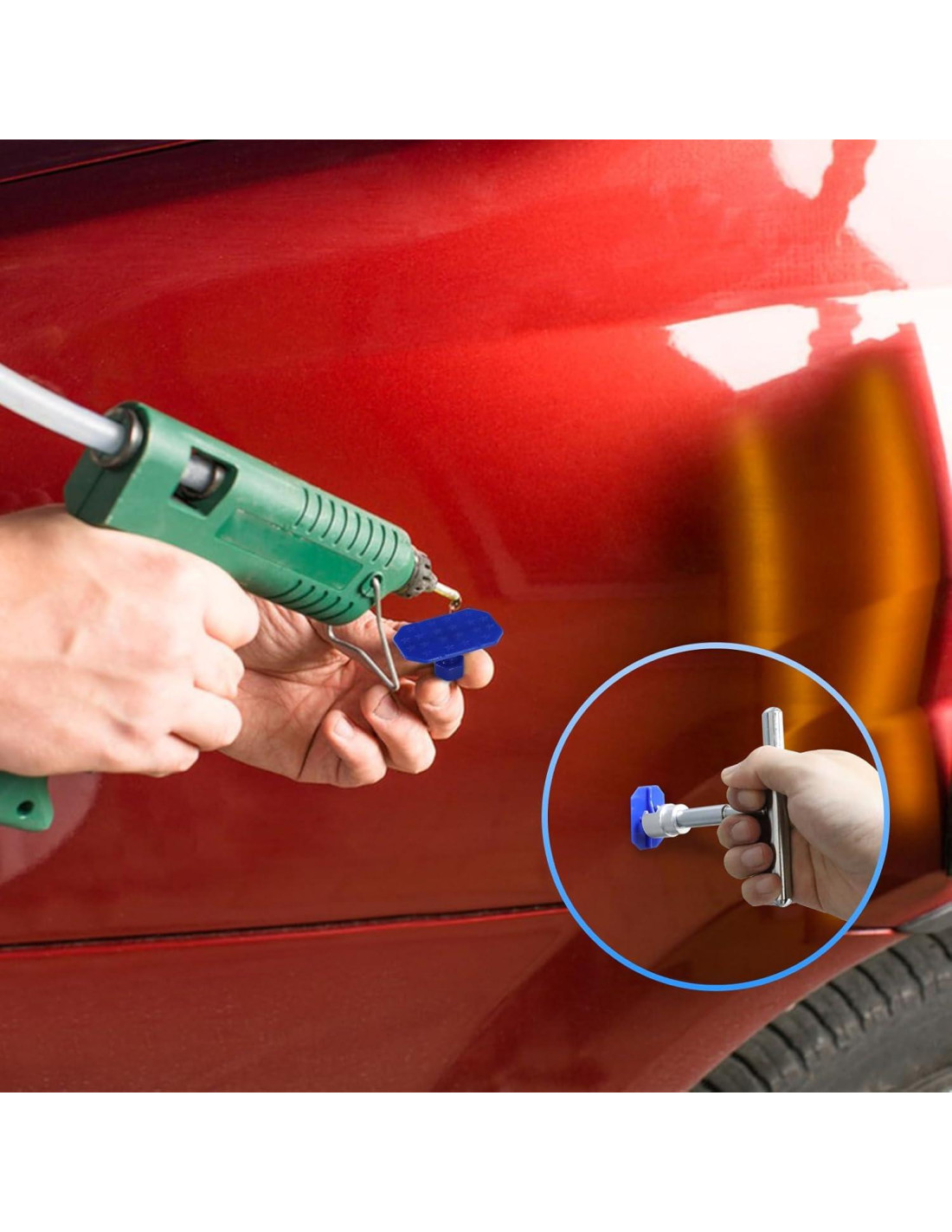 - [Fácil de operar] Este kit de reparación de abolladuras se puede instalar fácilmente. Elija el tamaño correcto de la almohadilla de extracción y aplique pegamento en ella con pegamento caliente, luego pegue la pestaña en la abolladura durante 2-3 minutos, adjunte el mango y tire suavemente para reparar la abolladura.
