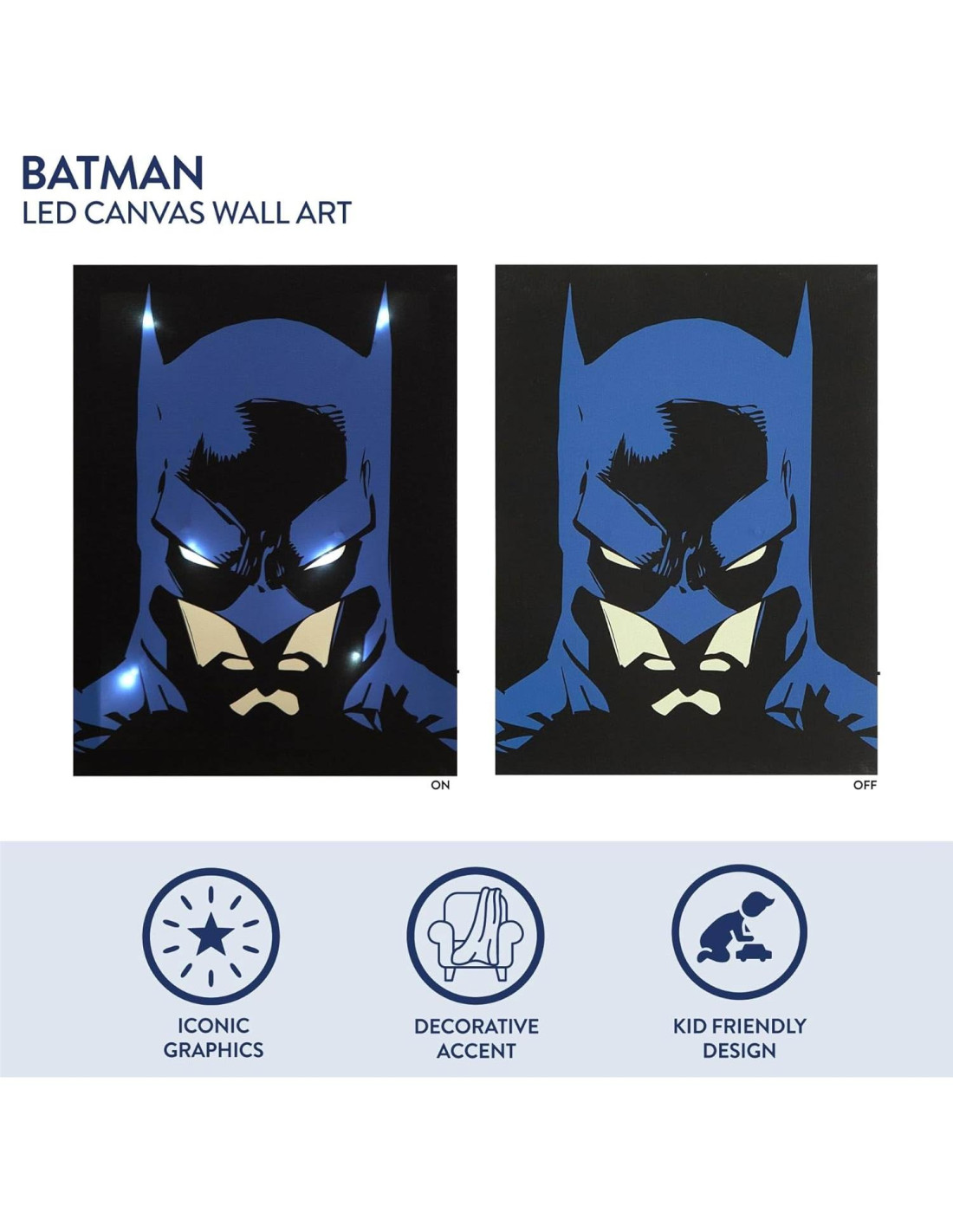 Cuelga la obra de arte en lienzo de Batman en la habitación de tu hijo. Las luces LED iluminarán la habitación de tu hijo para crear una hermosa ilusión en la obra de arte. Las luces emiten un suave resplandor que también se puede usar como luz nocturna. Tamaño: 40.01 cm de ancho x 29.21 cm de alto