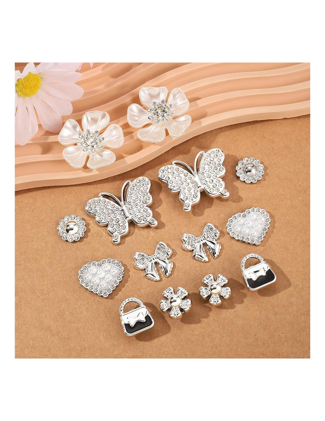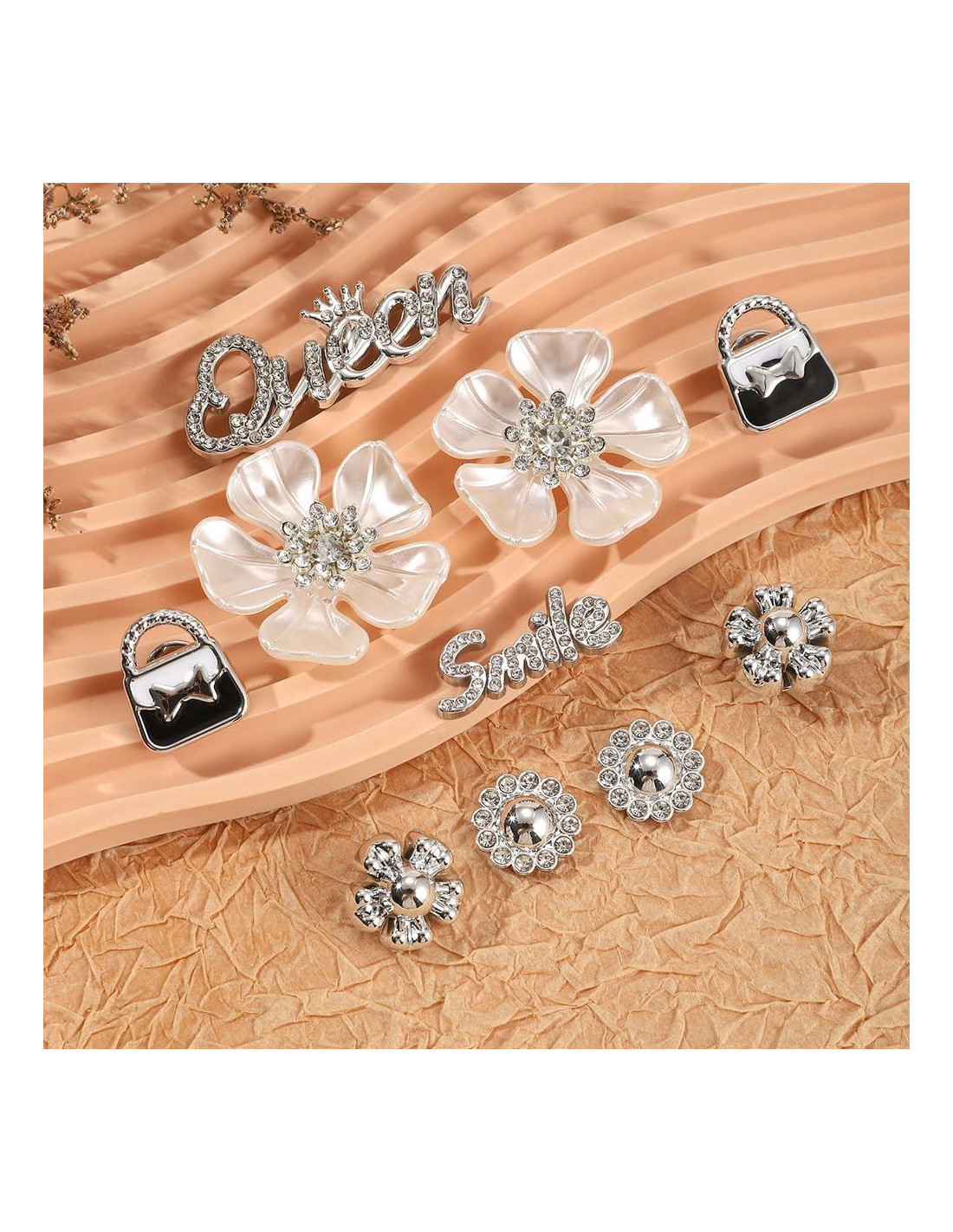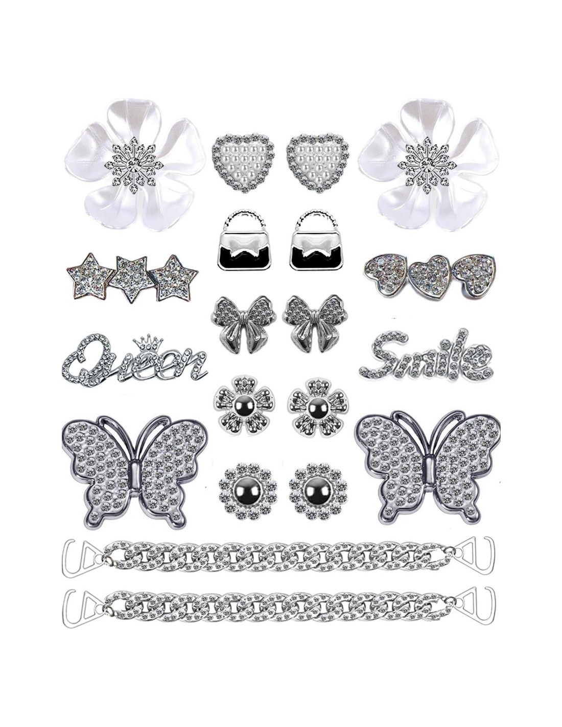 - [Contenido del Paquete] : Este conjunto incluye 18PCS de accesorios para zapatos plateados y dos cadenas plateadas con diamantes, con las mariposas brillantes, hermosas flores y las exquisitas letras REINA y SONRISA incorporando elementos elegantes para hacer que tus zapatos brillen y sean más únicos.