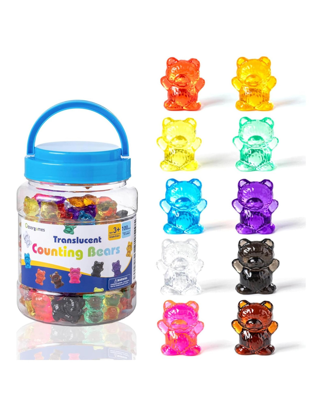 - Contadores de Oso de Peluche o Matemáticas: Este conjunto incluye 100 osos contadores translúcidos en 10 colores vibrantes. Los osos miden 2.54 cm (1 pulgada) de altura, pesan 3 gramos y vienen en un contenedor reutilizable para un fácil almacenamiento.