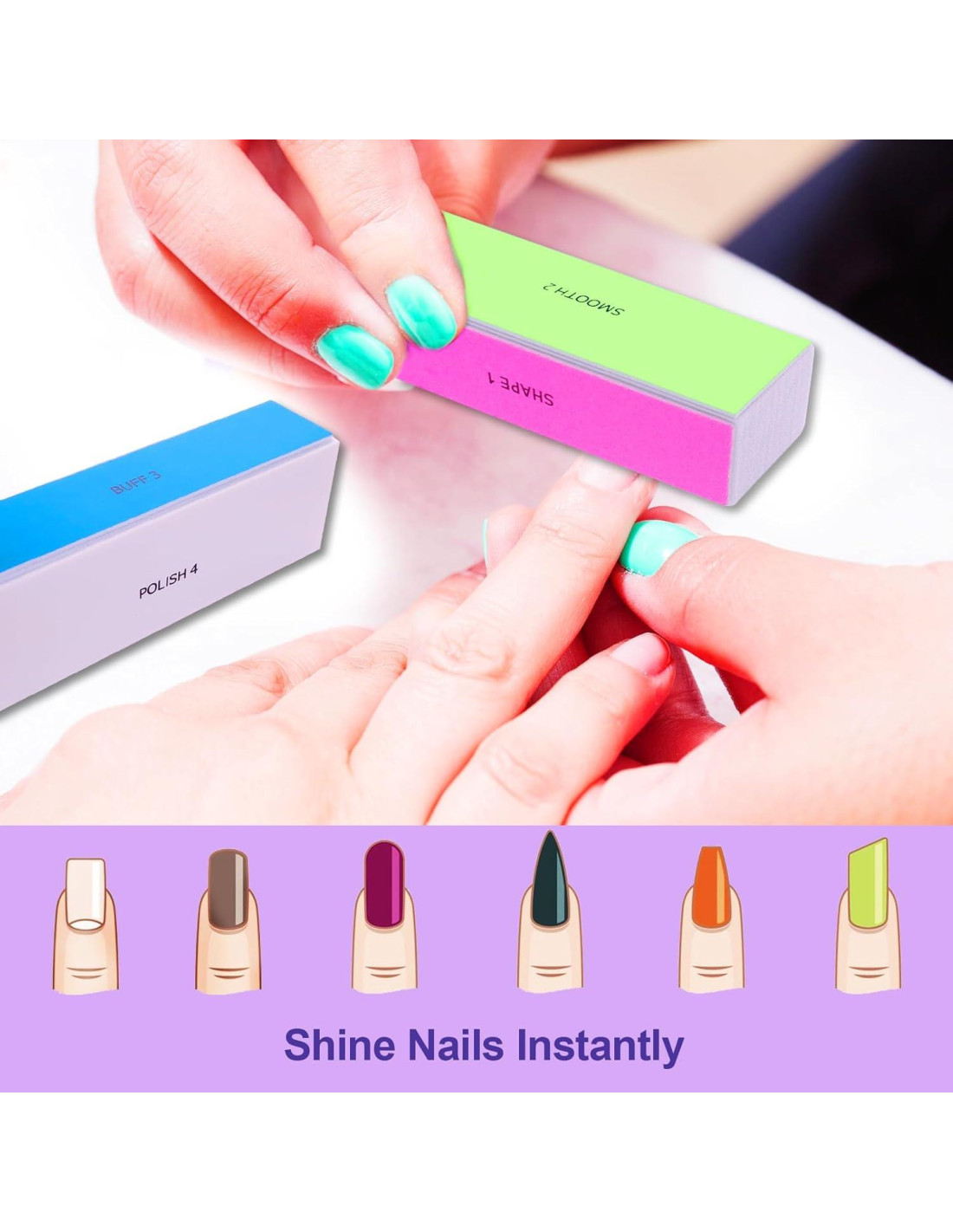 - Logra Uñas Brillantes Sin Esfuerzo: Nuestro bloque de pulido de uñas tiene cuatro lados para dar forma, suavizar, pulir y abrillantar las uñas. El lado rosa lima y da forma, el lado verde suaviza, el lado azul pule, y el lado blanco abrillanta, dándote uñas naturales o artificiales super brillantes. Es perfecto para uñas naturales y acrílicas, ofreciendo resultados impecables cada vez.