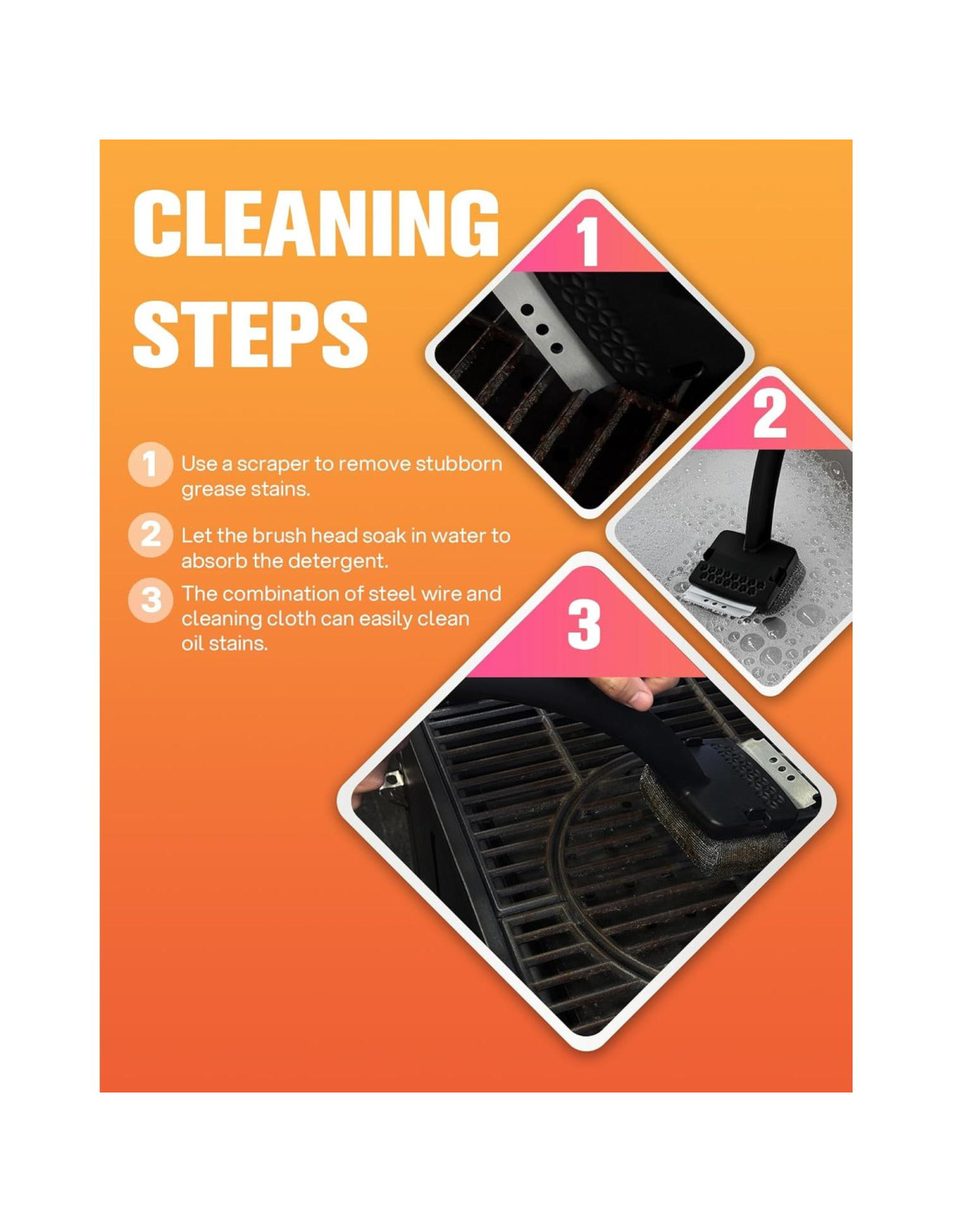 - [Sistema de Limpieza 3 en 1] El limpiador de parrilla para parrilla exterior cuenta con tres funciones de limpieza en uno: Usa el cepillo para fregar y limpiar la parrilla Usa el raspador y la muesca en forma de "U" en el lado del raspador para raspar manchas difíciles en la parrilla Usa los agujeros circulares en el raspador para quitar manchas de los pinchos de kabob. Con cobertura de 360 grados, no deja manchas ocultas, brindándote una experiencia de parrilla impecable cada vez.
