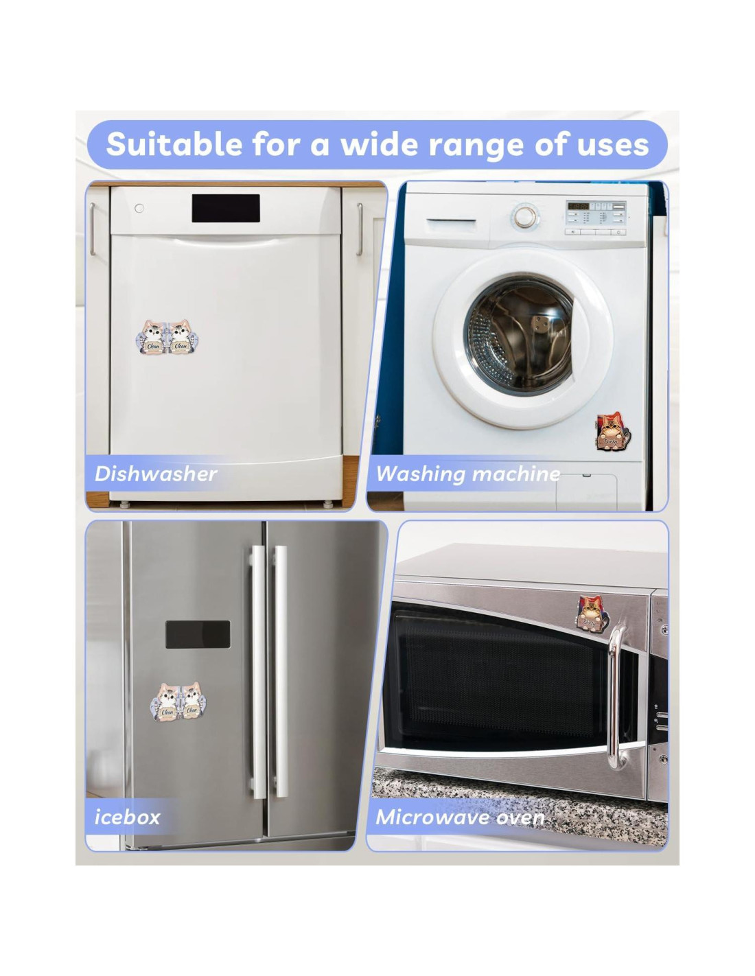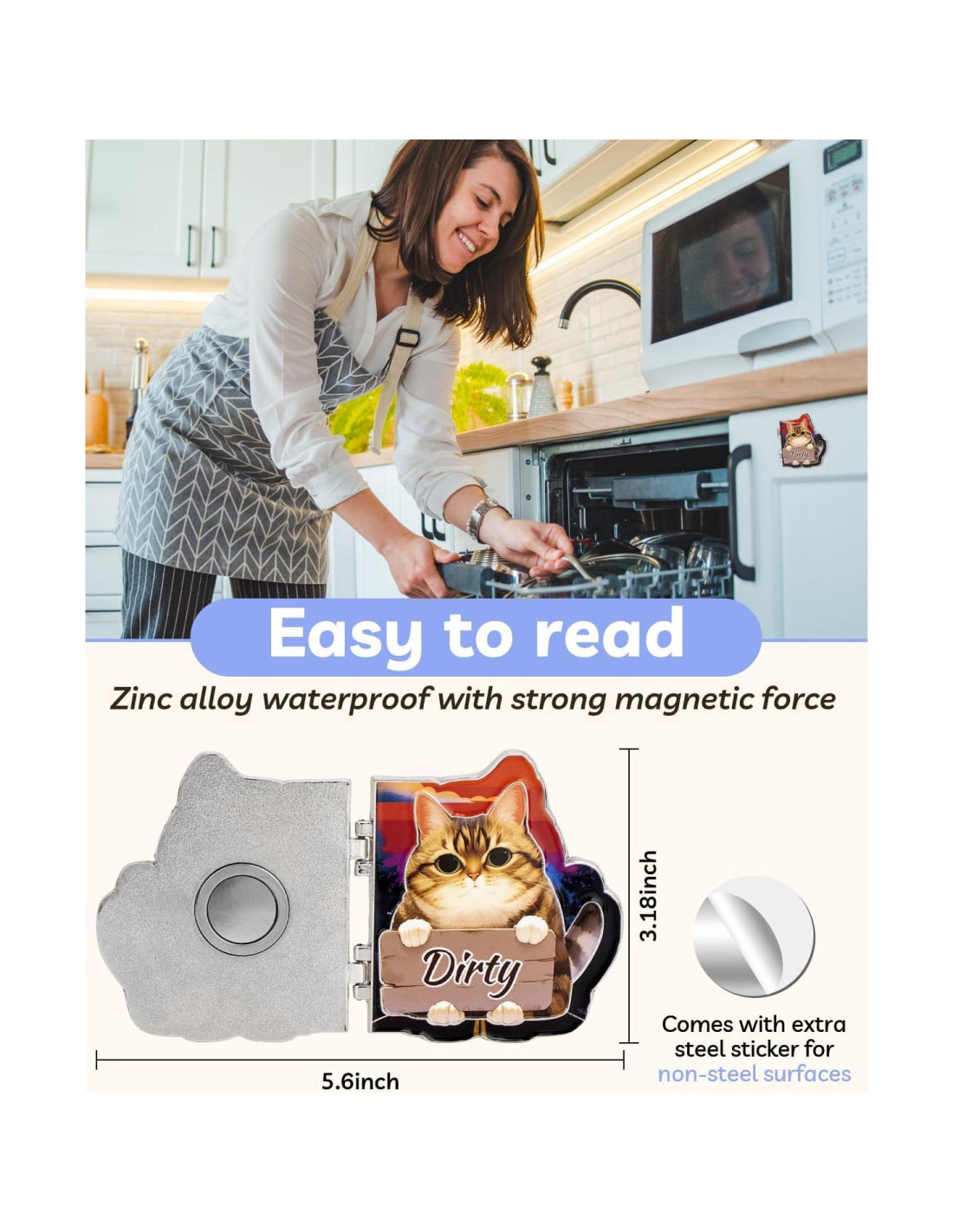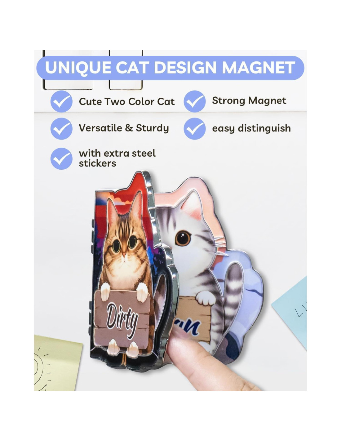 - Lindo y Funcional: Un imán de gato con diseño de giro juguetón que alegra tu cocina mientras muestra claramente el estado de los platos "Limpio" o "Sucio".