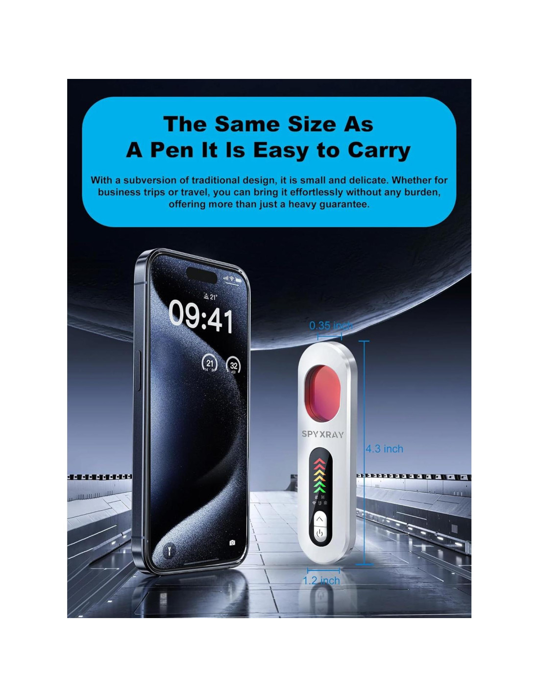 ¿Detecta cámaras ocultas en wifi de 5ghz? Sí, detecta cámaras ocultas que operan en WiFi de 5GHz. El detector tiene un rango de frecuencia de 1-6.5GHz, que cubre la banda de WiFi de 5GHz utilizada por muchas cámaras ocultas. ¿Requiere recargas frecuentes? Este detector de cámaras ocultas ofrece hasta 18 horas de operación continua y un tiempo de espera notable de hasta 30 días, asegurando fiabilidad durante viajes prolongados. ¿Alerta sobre rastreadores GPS ocultos? Sí, puede detectar rastreadores GPS: Detección de Señal - Escanea frecuencias de radio (RF) emitidas por rastreadores GPS activos. Detección Magnética - Detecta rastreadores GPS con partes magnéticas (como montajes magnéticos). ¿Detecta tipos de señales además de cámaras? ¡Sí! Nuestro detector escanea 1-6.5 GHz, detectando señales de rastreadores GPS, dispositivos inalámbricos y otros dispositivos RF, no solo cámaras. ¿Son sus capacidades de detección lo suficientemente sensibles para prevenir falsas alarmas? 5 niveles de sensibilidad ajustables te permiten personalizar el escaneo: más bajo para áreas concurridas para evitar falsas alarmas, más alto en espacios tranquilos para una detección exhaustiva. ¡Detecta instantáneamente cámaras y dispositivos ocultos! Compacto, fácil de usar y protege tu privacidad. ¡Asegura el tuyo ahora! ¿Preocupado por ser espiado? Spyxray te respalda. Detección de Precisión: Localiza fácilmente cámaras ocultas y dispositivos de escucha, ¡sin importar cuán bien ocultos estén! Fácil de Usar: Operación con un solo botón, escaneo rápido, no se necesita experiencia técnica, ¡cualquiera puede usarlo! Compacto y Portátil: Llévalo a cualquier parte, protege tu privacidad en cualquier momento y lugar.