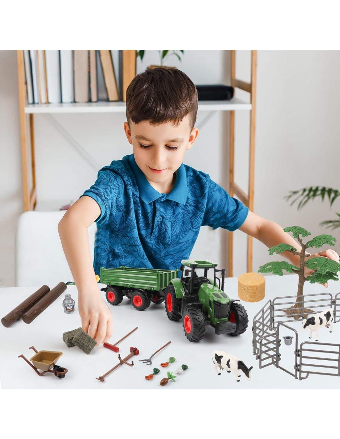 - ¡Desata la diversión en la granja con nuestro Conjunto de Juguetes de Tractor de Animales de Granja! Prepárate para embarcarte en emocionantes aventuras imaginarias alrededor de la granja con un tractor de 16.5 pulgadas (41.91 cm) con remolque, cerca, árbol y vaca, etc., incluidos en el conjunto.