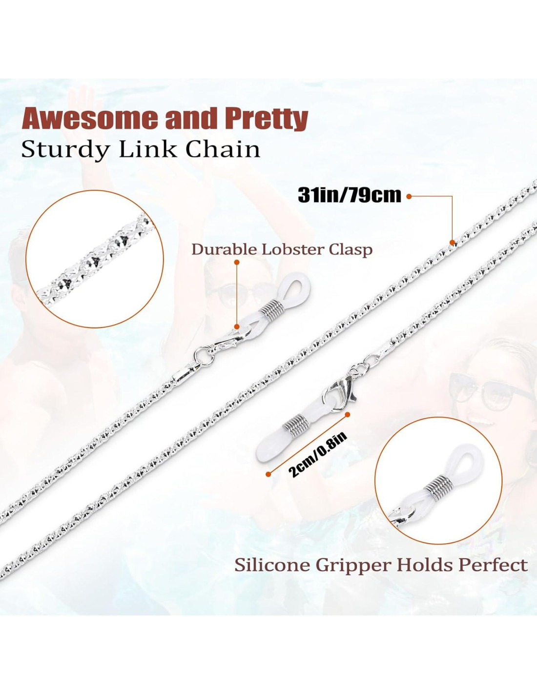 - Color y tamaño: 3 colores de plata, oro rosa y negro, tamaño de la cadena para gafas: aproximadamente 31 inches (78,74 cm) x 0.06 inches (0,15 cm), longitud de la punta de goma es 0.8 inches (2,03 cm)