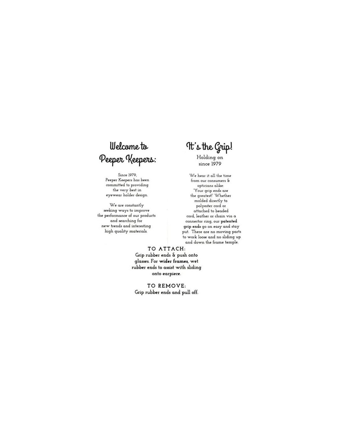 - IT'S ABOUT THE GRIP! ¿Cansado de lidiar con cadenas de gafas baratas que siguen rompiéndose? Peeper Keepers es la solución. Los agarres patentados no se romperán. Este cordón trenzado de poliéster hecho en Estados Unidos es extremadamente DURADERO y cómodo.
